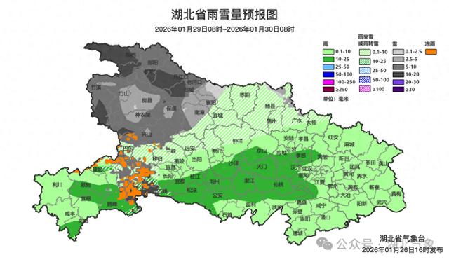 1月29日08时-30日08时,鄂西北西部小雨转中到大雪、局地暴雪;鄂西北东部、鄂东北西部、鄂西南北部、江汉平原北部小雨转雨夹雪,山区小到中雪、局地大雪或冻雨;其他地区阴天转小到中雨。最高气温中西部3~9℃、东部10~15℃,最低气温鄂西北-1~1℃、其他地区1~6℃,偏北风3到4级、阵风5到7级。