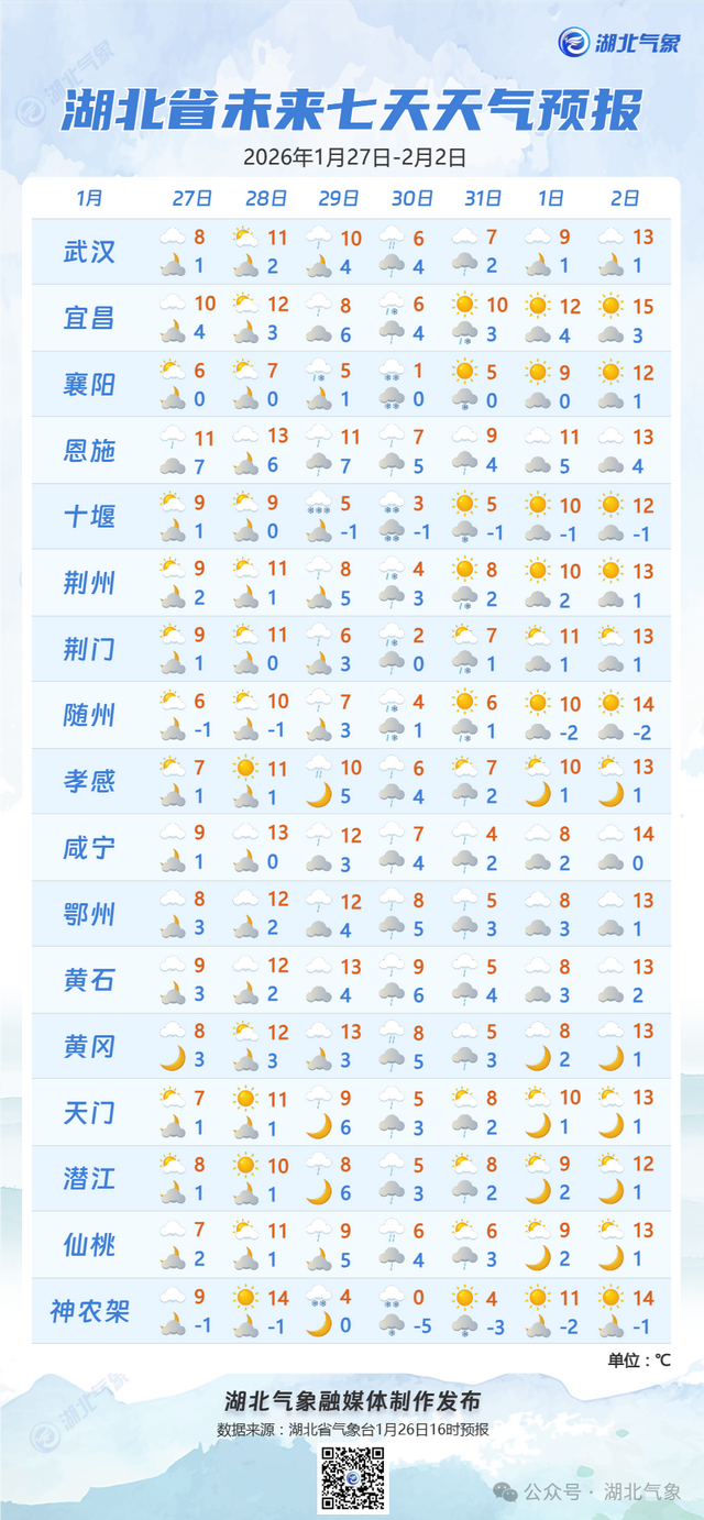1月28日08时-29日08时,鄂西北西部、鄂西南多云转小雨,其中神农架高海拔地区有雨夹雪或小雪;其他地区多云间晴天。最高气温9~14℃,最低气温1~5℃,偏东风2到3级。