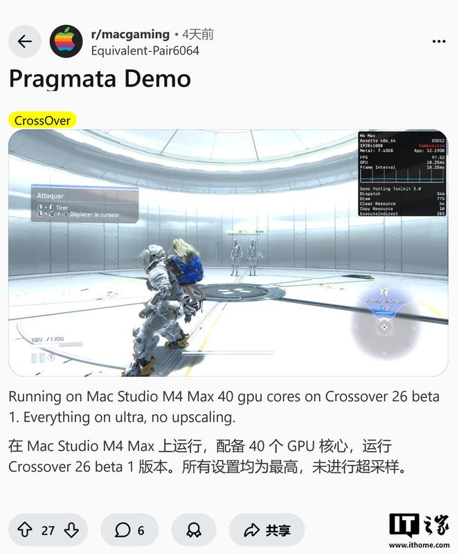 IT之家1月27日消息,网友Equivalent-Pair6064于1月23日在Reddit社区发帖,在搭载16核CPU和40核GPU的M4MaxMacStudio上,通过兼容性工具Crossover26Beta1运行卡普空《识质存在》(PRAGMATA)游戏,跑出近100FPS的流畅帧率。
