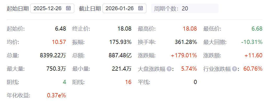 同花顺iFinD数据显示,湖南白银近一个月股价持续上涨,自2025年12月26日起截至上一交易日(1月26日)收盘,区间累计涨幅达179.01%。