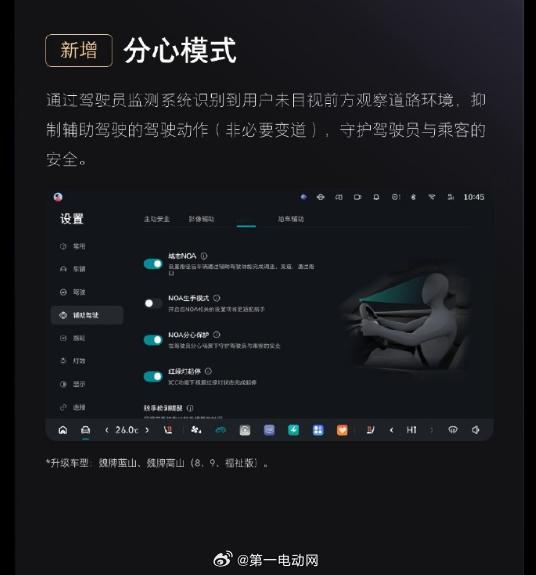 魏牌高山魏牌蓝山 将进行OTA3.4版本升级,智驾方面主要是优化功能:- 智驾多项能力提升,优化横向与纵向控制变道舒适性,红绿灯场景泊车传感器报警策略,变道灯功能全面提升辅助驾驶体验;- 新增分心模式,通过驾驶员监测系统识别非驾驶类动作辅助驾驶员纠正守护驾驶与乘客安全;具体体验如何,在我们的第二届中国智驾大赛 3月的金华站大家可以期待一下,欢迎高山/蓝山的车主报名 智能驾驶