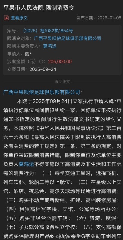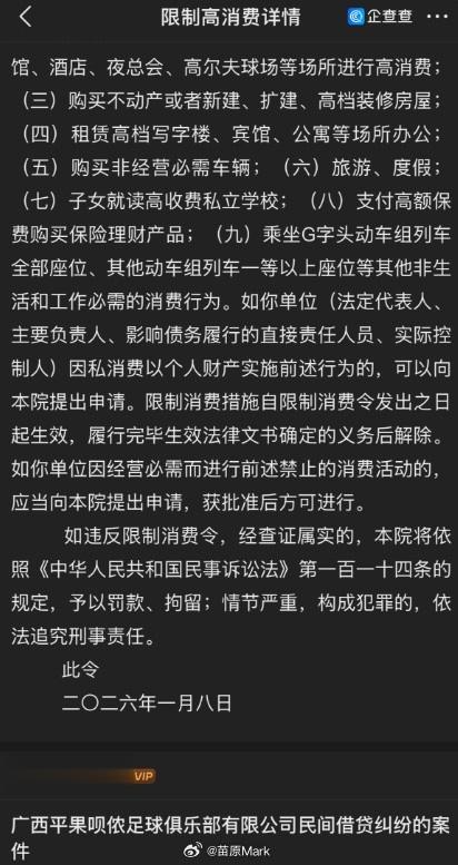 直播吧1月27日讯据媒体人苗原消息,平果男女足公司法人双双被限高,男足还欠着过生日订蛋糕的钱。