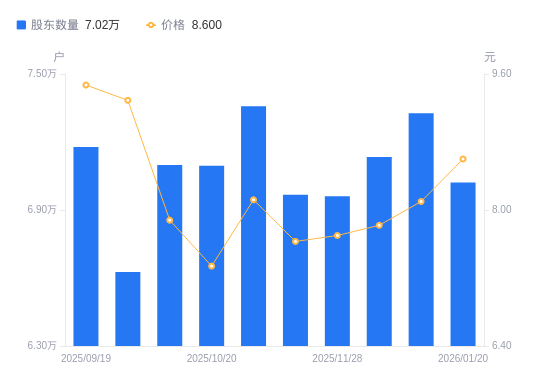 日期A股户数(户)流通A股户均持股数(股)户均持股市值(万元)2025-12-197326922004.2417.822025-12-107133522600.8117.672025-11-286961023160.8817.832025-11-206967223140.2717.662025-11-107358221910.6417.792025-10-207095122882.6016.802025-10-107098222872.6118.022025-09-306626524500.7722.762025-09-197177622619.5921.422025-08-297377622006.3918.88