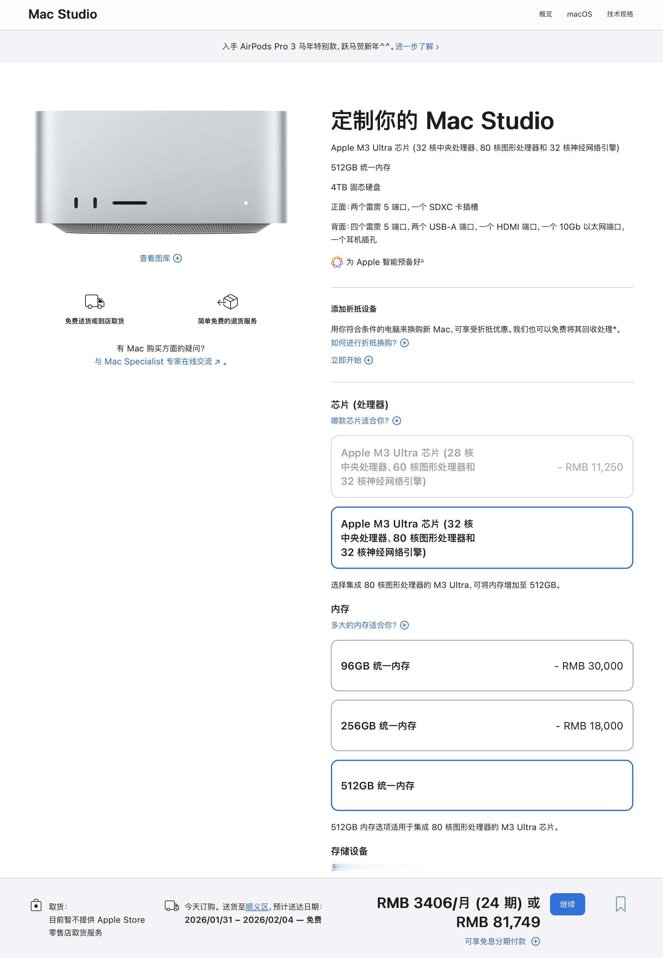 手里还有这么两台机器,Mac Studio Apple M3 Ultra 芯片 (32 核中央处理器、80 核图形处理器和 32 核神经网络引擎),512GB 统一内存,4TB 存储。原价 81749Mac Studio Apple M3 Ultra 芯片 (32 核中央处理器、80 核图形处理器和 32 核神经网络引擎),512GB 统一内存,8TB 存储。原价 90749都全新原封,咱们就按 85 折出吧,69500,77000。喜欢您来。