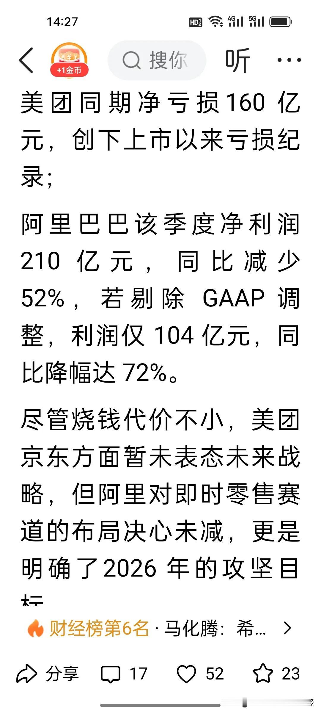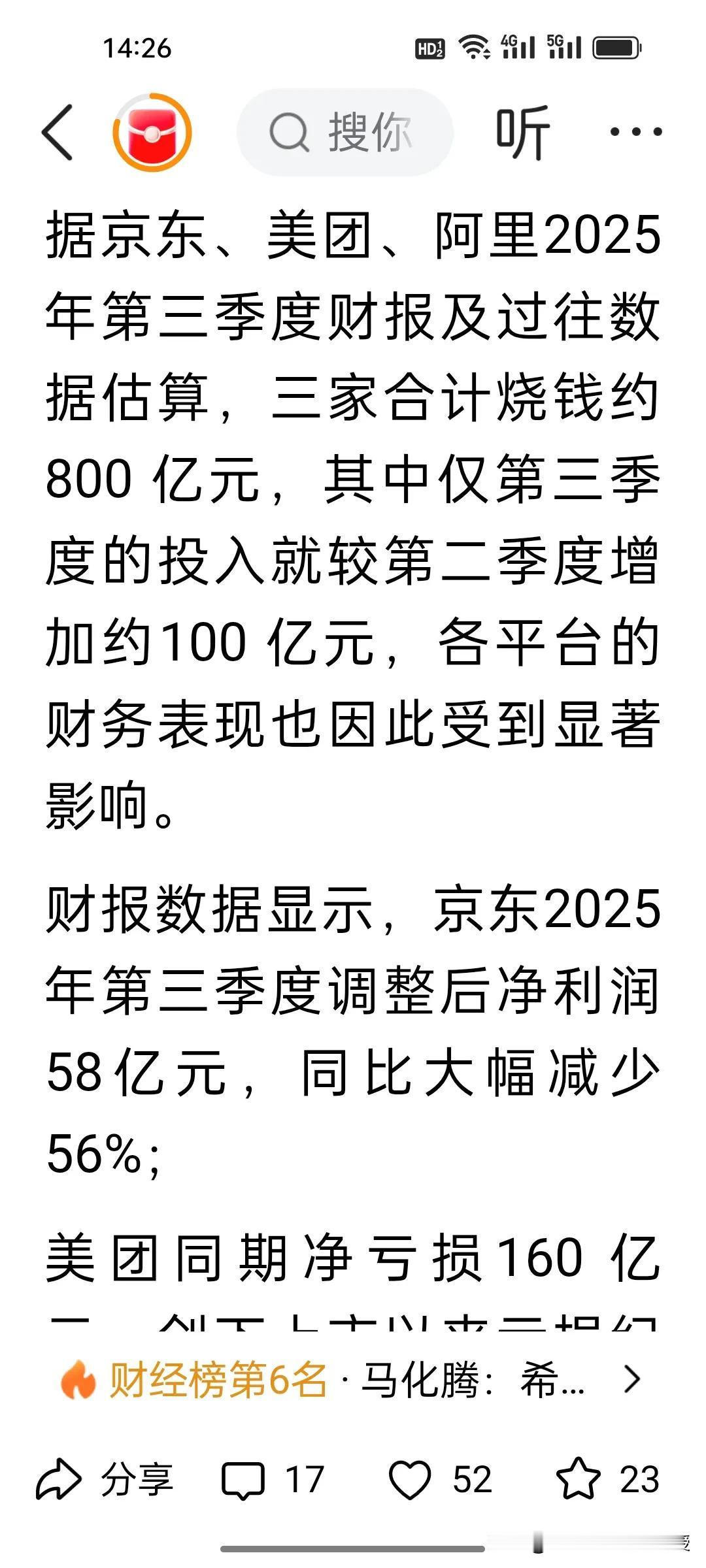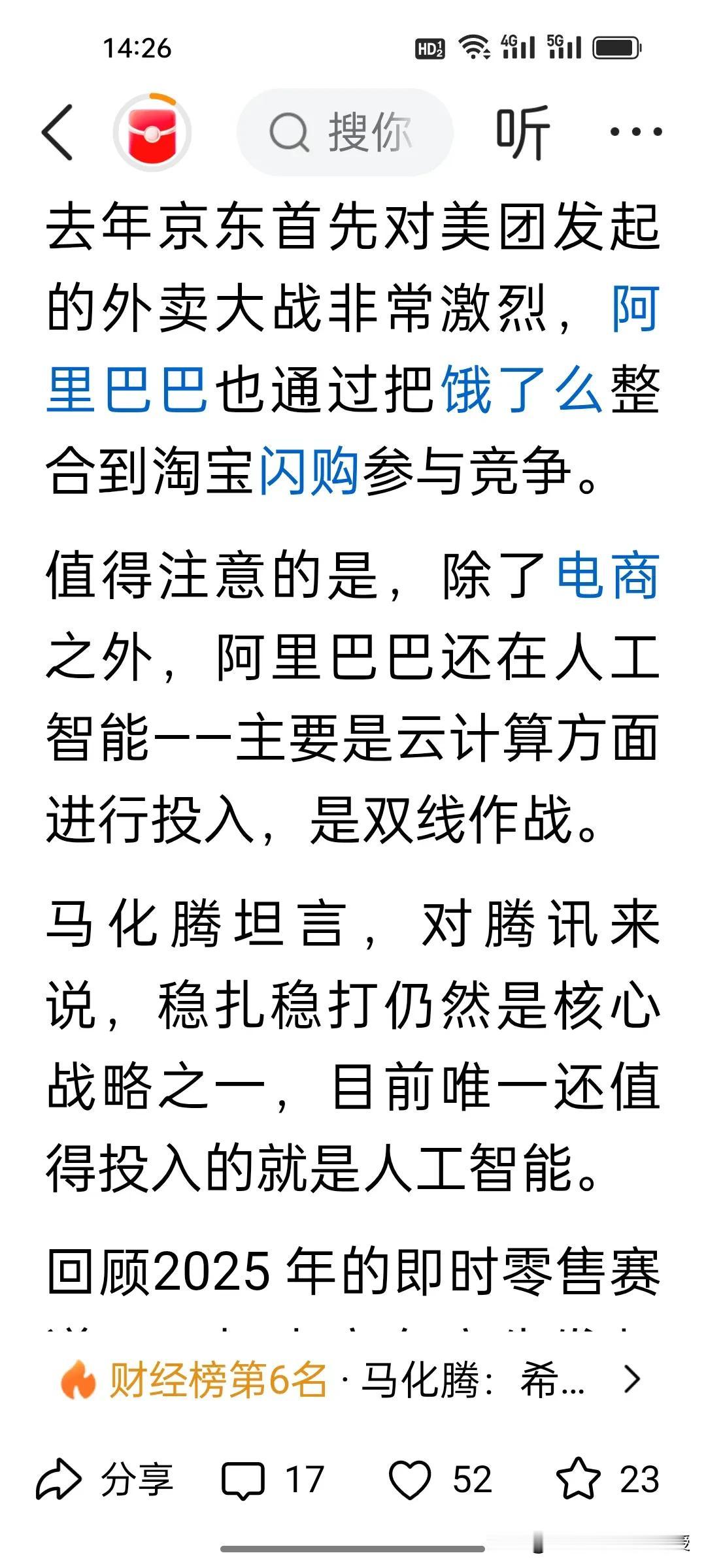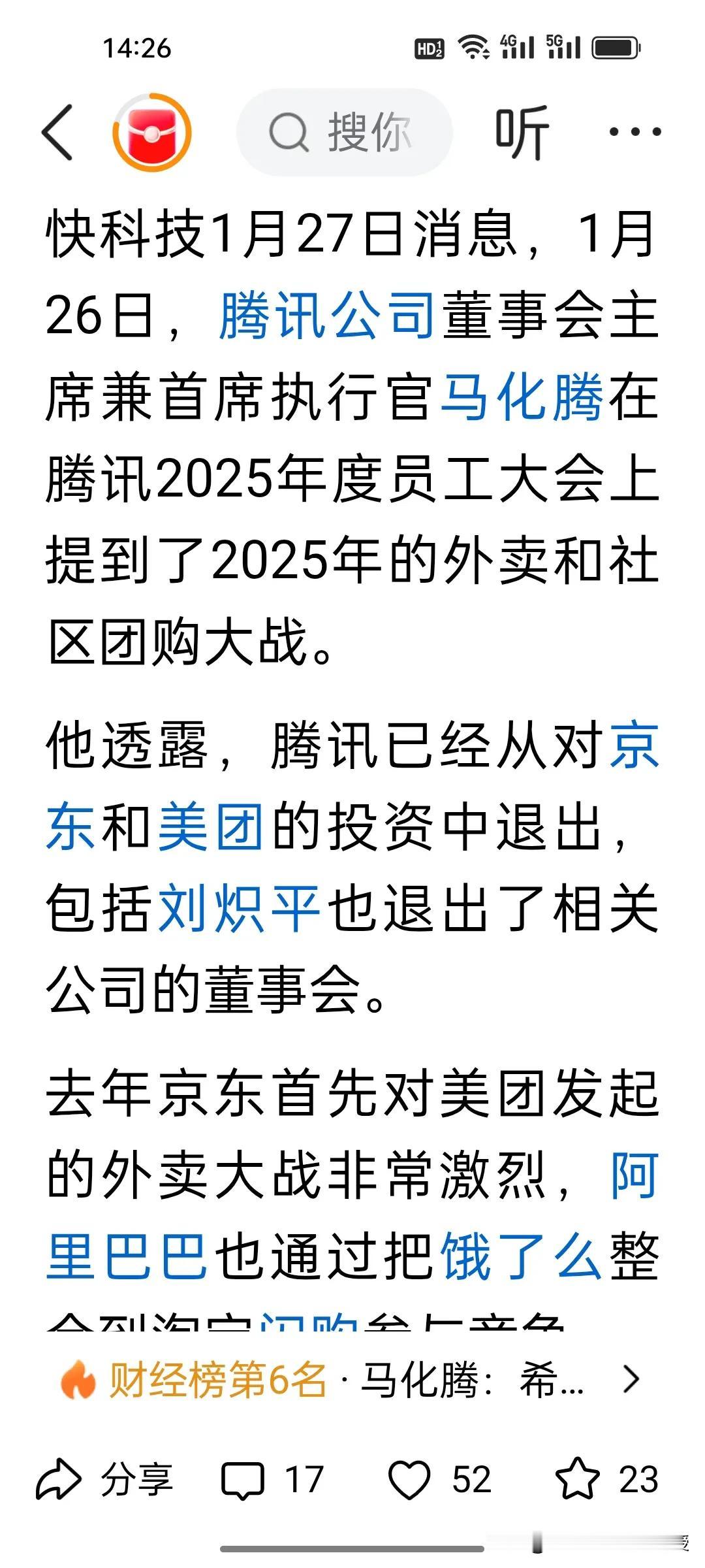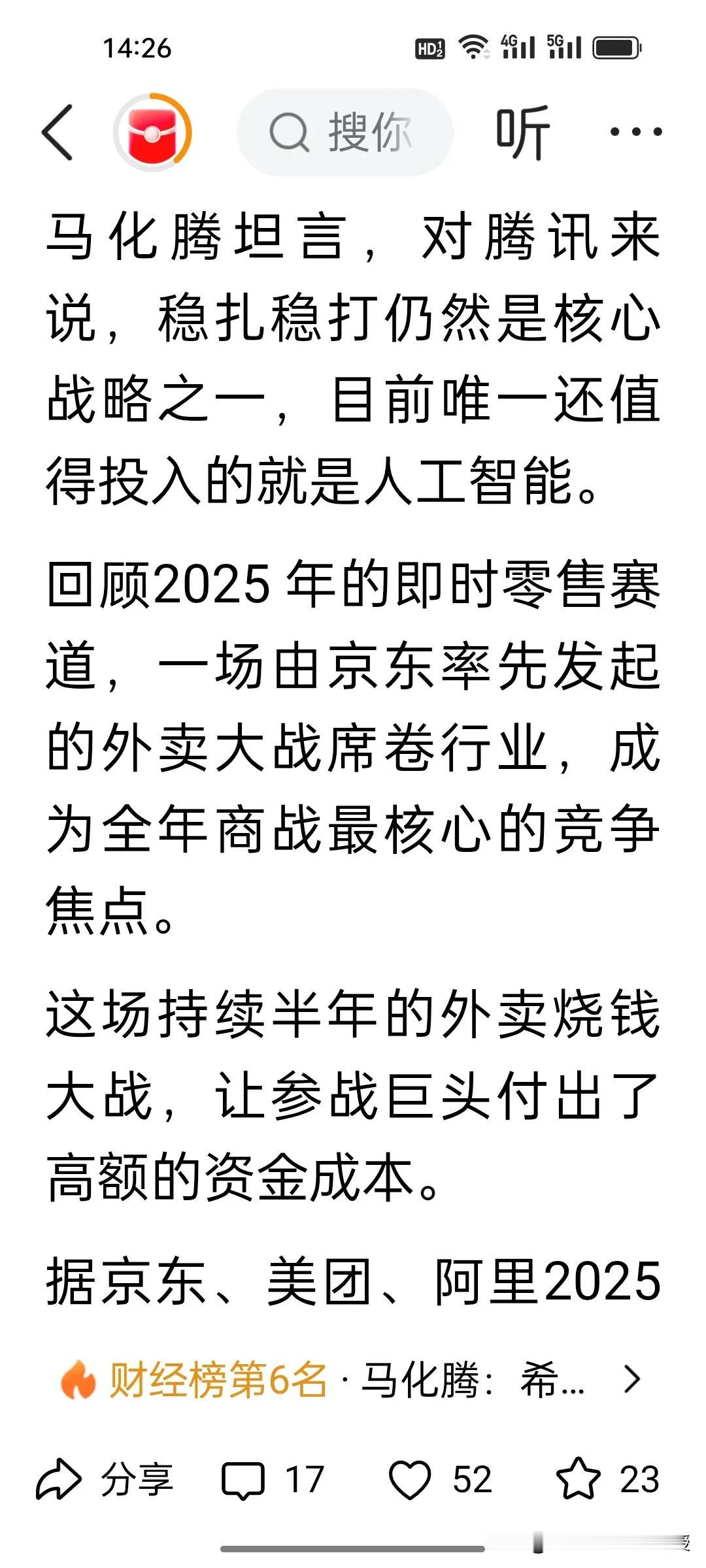 腾讯撤资京东美团而押注AI,是马化腾保守还是远见? 手握千亿现金的腾讯,为何要从京东、美团的投资中全身而退? 在即时零售烧钱大战里,阿里、京东、美团半年烧掉800亿,美团单季亏损160亿,这场惨烈的商战让马化腾看清:烧钱换规模的游戏,腾讯玩不起也不想玩。与其在不确定的赛道里陪跑,不如把资金聚焦到更具确定性的AI上,这既是腾讯“稳扎稳打”的基因延续,也是对未来十年技术周期的精准押注。 从社交到投资再到AI,腾讯的每一次转身都在回答同一个问题:企业如何在时代浪潮里守住基本盘?你觉得这步棋走对了吗?