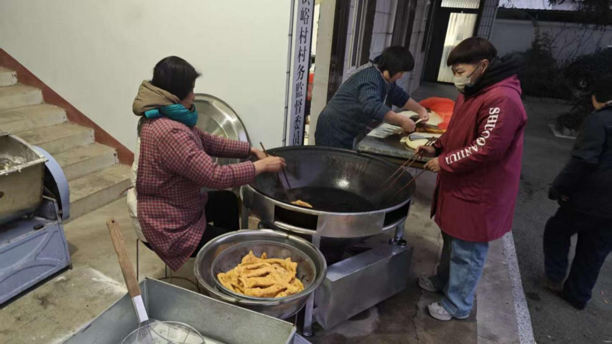 为保障活动顺利开展,洪峪村“两委”干部与志愿者们凌晨四点便投身忙碌。他们严格挑选糯米、红豆、红枣、花生等八种优质食材,以柴火慢炖的传统方式精心熬制腊八粥,确保粥品稠糯香甜、营养均衡;同时现场现炸油条,外酥里嫩的口感与腊八粥形成经典搭配,满足村民们的口味需求。