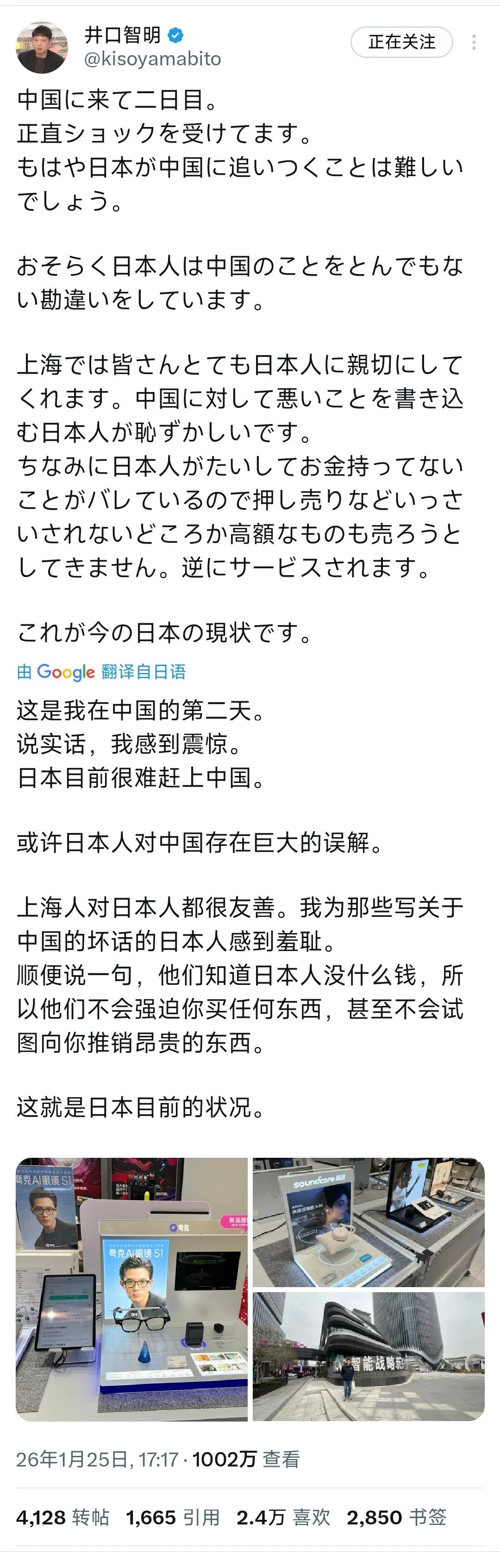 日本游客井口智明1月25日公开表示,这是我在中国的第二天。说实话,我感到震惊。 井口明智强调,日本目前很难赶上中国。或许日本人对中国存在巨大的误解。上海人对日本人都很友善。我为那些写关于中国的坏话的日本人感到羞耻。 事实上,我们一直都是抱着与邻为善的态度与其他国家相处的。但是日本近年来并不是这样的,日本在一些方面的表现让人无法接受。特别是高市早苗公开发出的挑衅性言论,更加让我们反感。 现在,有日本民众公开发出声音,并批评自己国家一些人的看法,这确实是难能可贵的。当然,这改变不了什么,但至少可以说明,有不少日本人是清醒的。