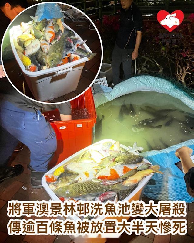 要爱护动物 「將軍澳景林邨 洗鱼池 變大屠殺 逾百條魚被放置大半天脫氧慘死……」【動物突發】將軍澳景林邨發生殘酷對待動物案件,香港救援鳩鴿及雀鳥 義工收到求助,指景林邨景棉樓對出魚池昨日(1月26日)安排清潔公司洗池,管理處及清潔工人竟只將池中逾百條魚撈起放在一旁的3個箱子及小水池,疑氧氣泵有問題,多條魚死亡,而由中午至今放置大半天竟沒人理會,有熱心市民晚上7時許發現後報警,警方及愛護動物協會督察均到場。最新數字顯示共有122條魚證實死亡,另有74條魚生還,但部分倖存魚隻十分虛弱。義工對本報表示,今日有清潔公司洗魚池,將魚撈起放一旁,結果大量魚死亡,死亡數字不斷上升,「希望有人可以救這些魚,救得幾多得幾多。」報案人對本報表示,她在晚上7時許經過時發現魚被放在3個箱及1個小水池,懷疑氧氣泵有問題,已經有多條魚死亡,她當即報警及報愛協,並已落口供。義工表示,已確認122條魚死亡,當中不少是錦鯉。本報正向愛協查詢具體情況。香港動物救援機構「龜途」創辦人阿邦深夜亦到場協助救援,據知生還魚有74條,另現場還有4隻龜,包括兩隻巴西龜和兩隻草龜。生還的魚凌晨已由阿邦、街坊及管理員移至另一個有氧氣泵、重新注水的魚池。(來源:香港動物報) … 香港