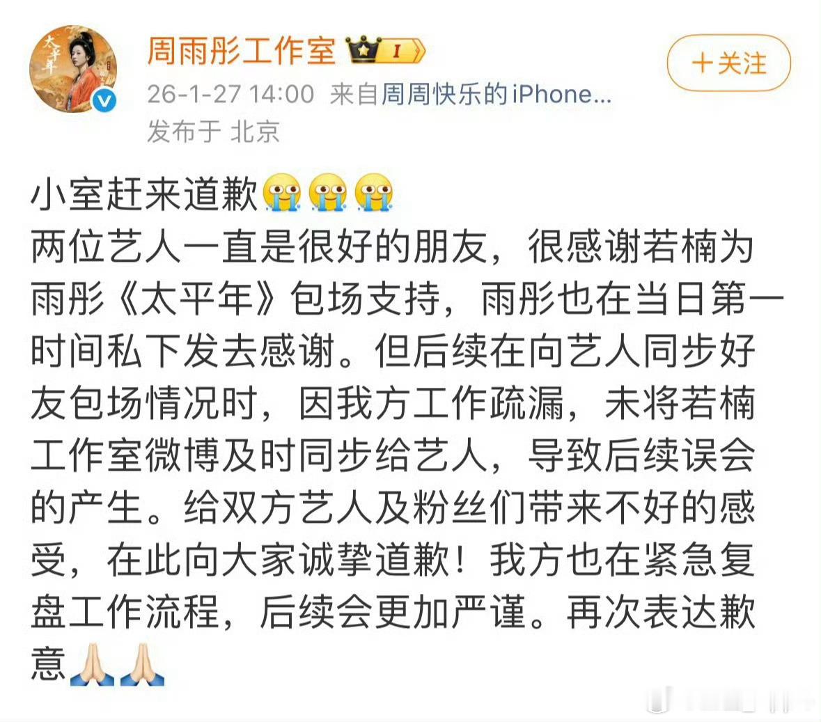 周雨彤工作室道歉整个事情脉络是章若楠、林允、吴越同一天给周雨彤新剧包场发博宣传, 周雨彤唯独没有及时回复章若楠工作室不过周雨彤或许只是事情比较多忙忘了,上线后就及时回复了 但是章若楠粉丝好像不买账不过周雨彤工作室赶快回应道歉了,感觉这事应该可以翻篇了🤔美女友谊长存,估计就是一个小误会