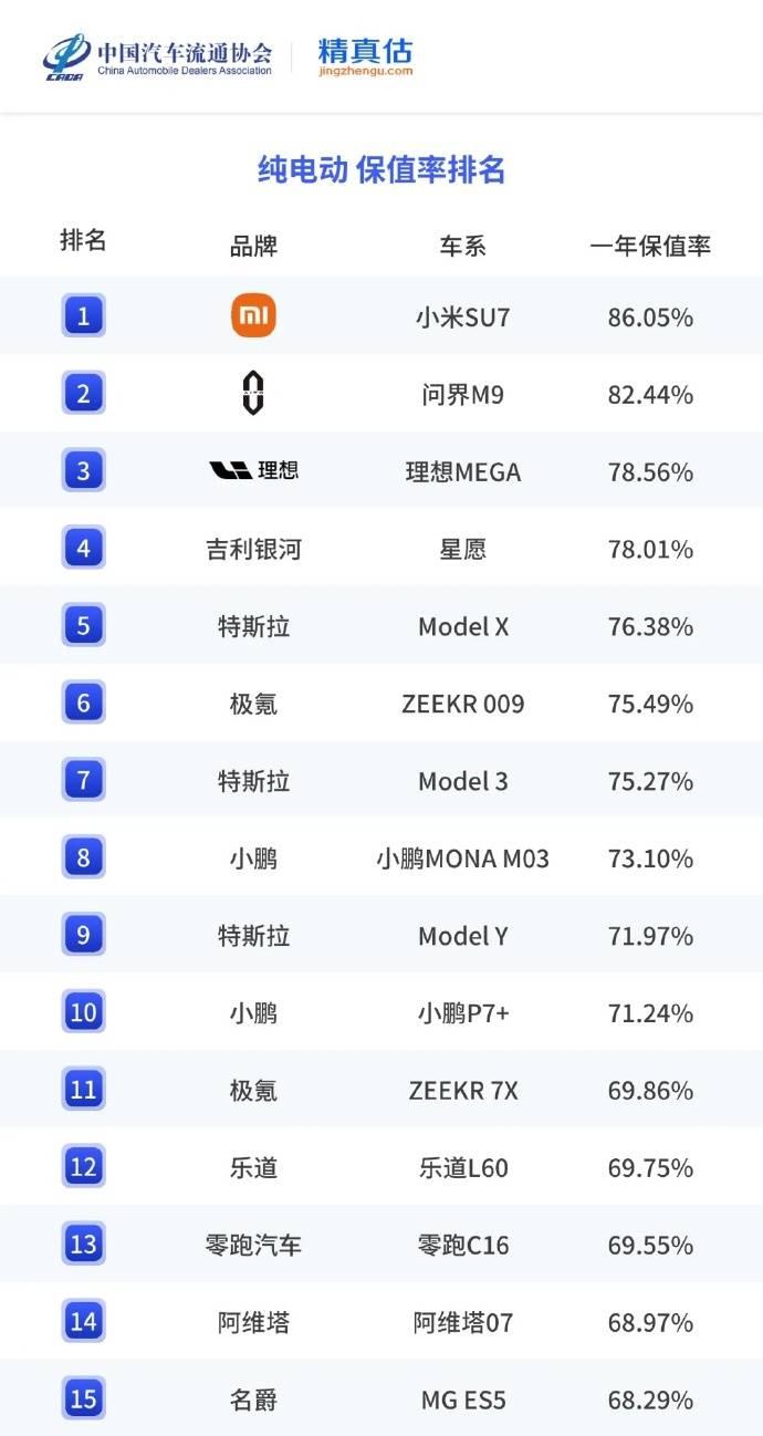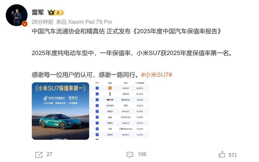 【科技快报网】1月27日,小米汽车官方微博官宣:“由中国汽车流通协会和精真估发布的《2025年度中国汽车保值率报告》,在纯电动车型中,小米SU7「一年保值率」获2025年度第一。这也是SU7上市以来,首次参与年度保值率榜单,并成为近三年「一年保值率」最高的纯电动车型。感谢每一位用户的认可,感谢一路同行。” 榜单显示,小米SU7一年保值率高达86.05%。 雷军也在微博转发了该榜单,表示感谢用户的认可。