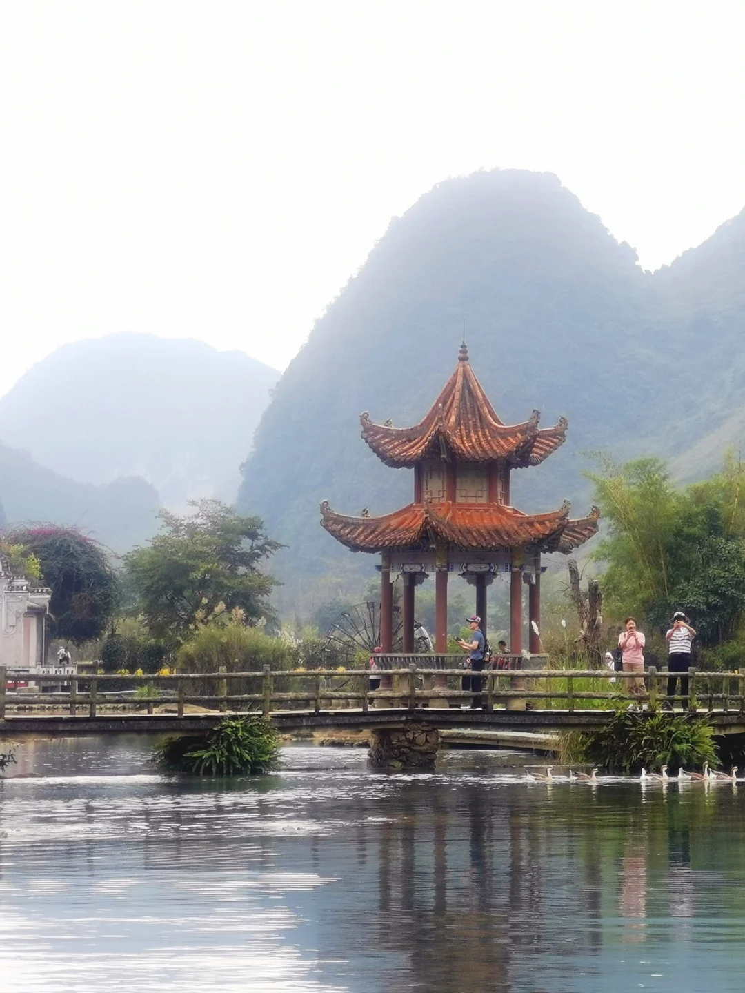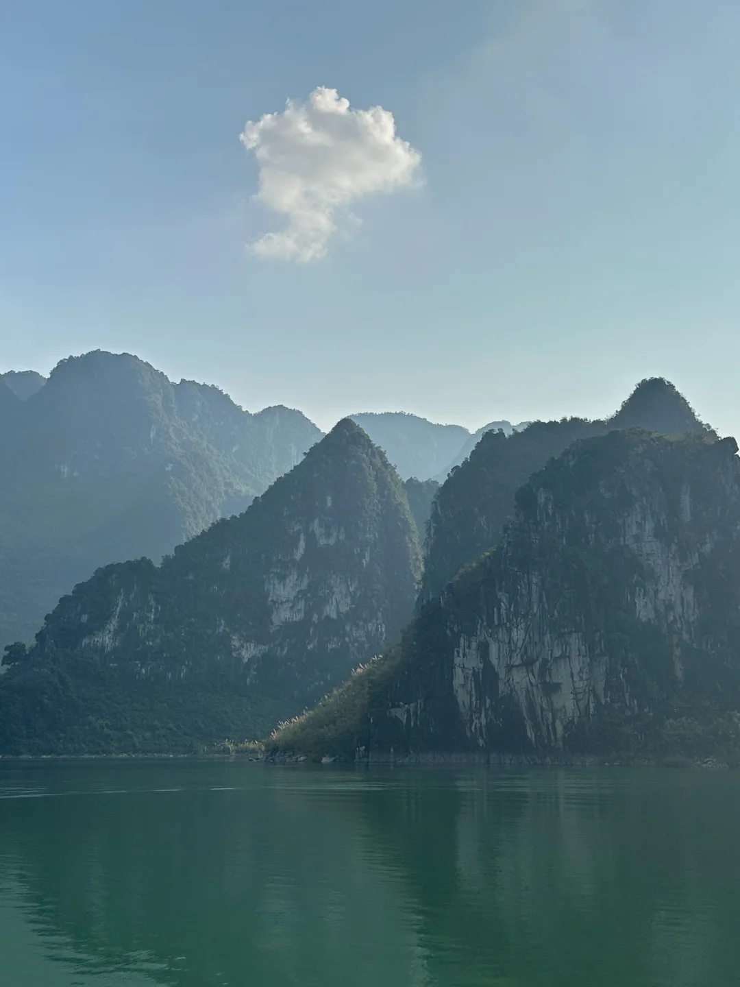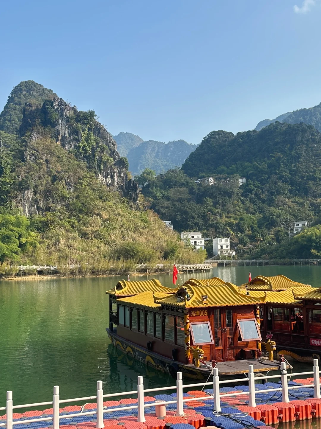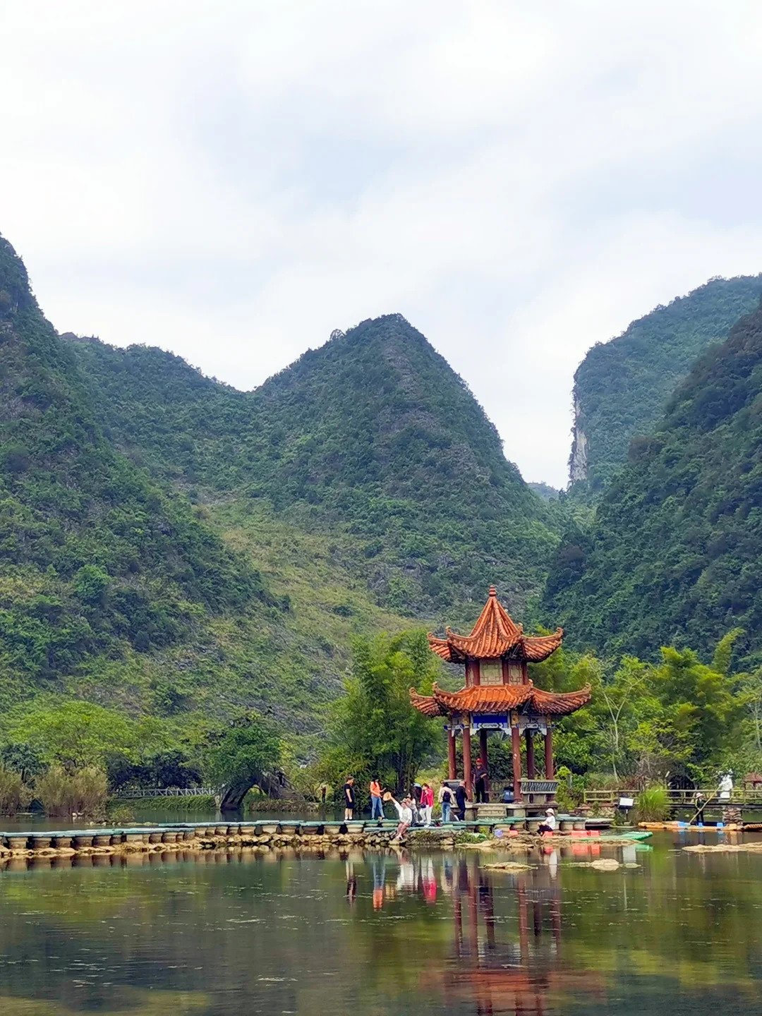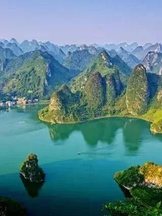 喀斯特山水画卷,湖水湛蓝,可沿湖骑行或者乘船游览,宁静治愈,值得张馨予二刷的网红美景!