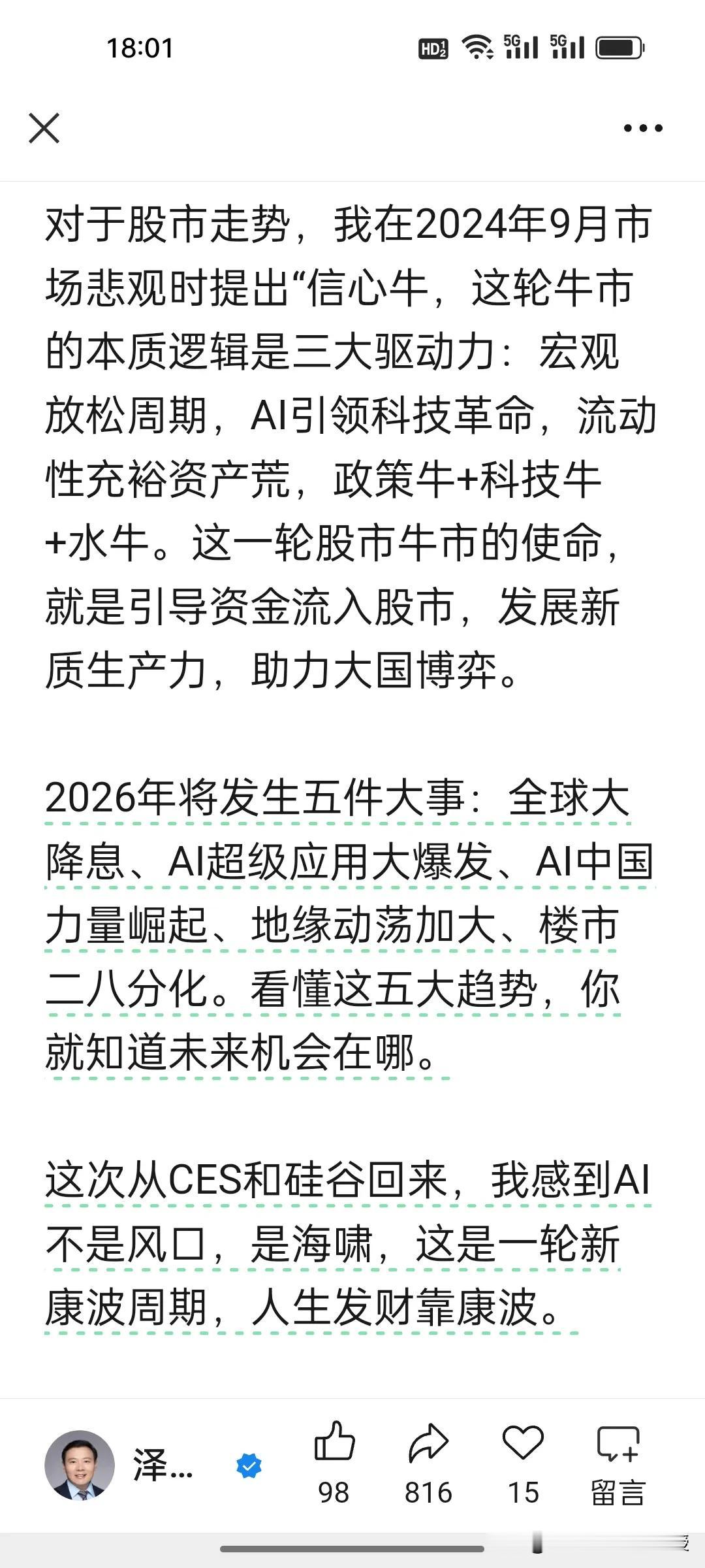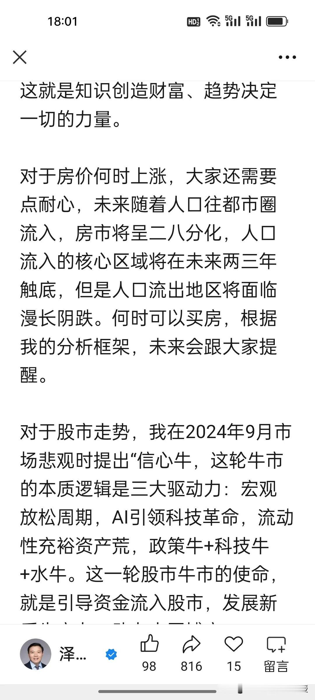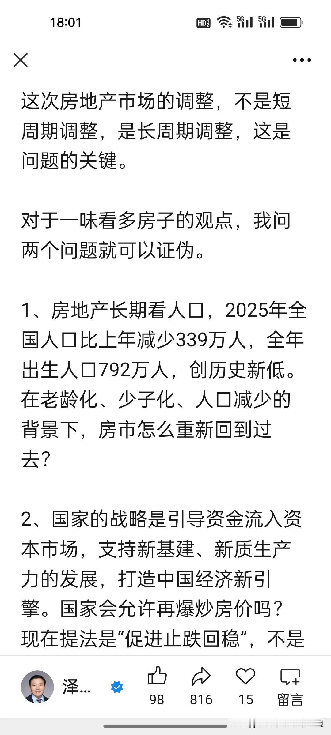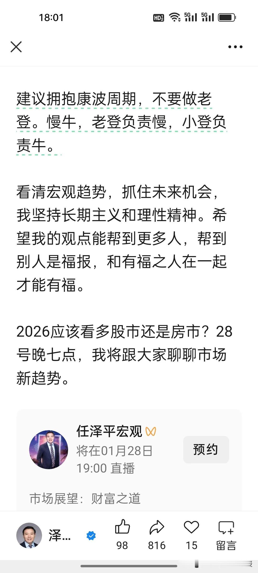 2026炒股还是买房?任泽平最新观点来了:房地产长周期调整,看好股市牛。 任泽平最新发文解析2026财富选择,五大核心观点点明“人生发财靠康波”:1.股市是货币晴表,2026货币宽松迎机遇;2.科技是股市主线,契合新质生产力;3.楼市普涨终结,迎二八分化;4.核心城市核心房产将触底;5.购房看政策、经济、供需三大信号。 这位昔日恒大经济学家在文章里说自己对于地产预测从未出错过,“至今无一失手”。可谓是信心爆棚啊! 其实,没有永远正确的预判,只有适合自己的选择!