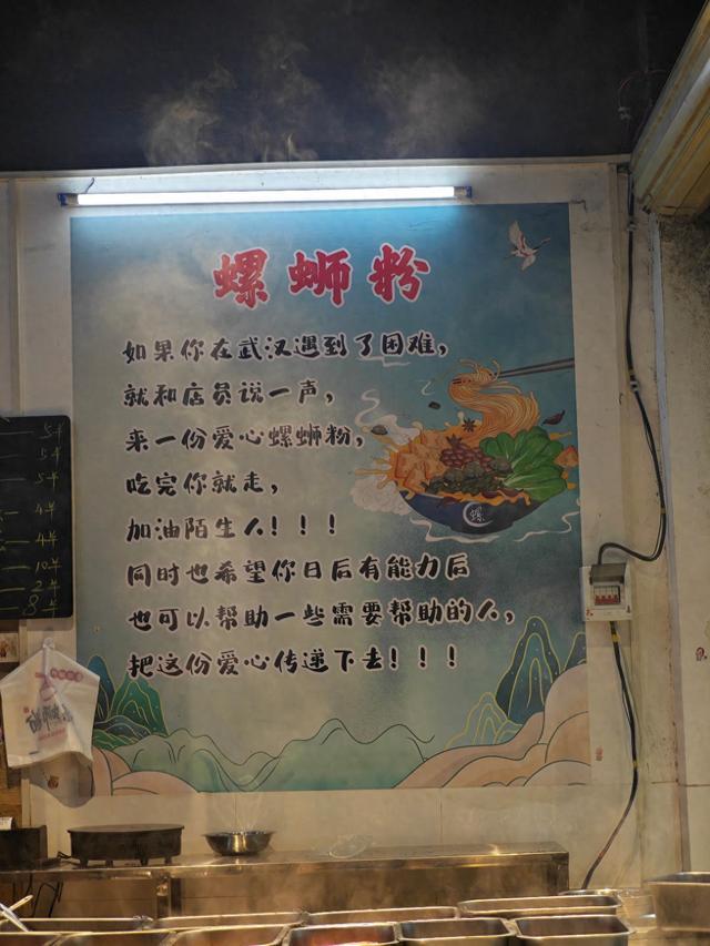 “如果你在武汉遇到了困难,就和店员说一声,来一份爱心螺蛳粉,吃完你就走,加油陌生人。同时也希望你日后有能力后,也可以帮助一些需要帮助的人,把这份爱心传递下去。”近日,湖北武汉市一市民向九派新闻反映,其在硚口区一家螺蛳粉店看见爱心标语,为此感动。