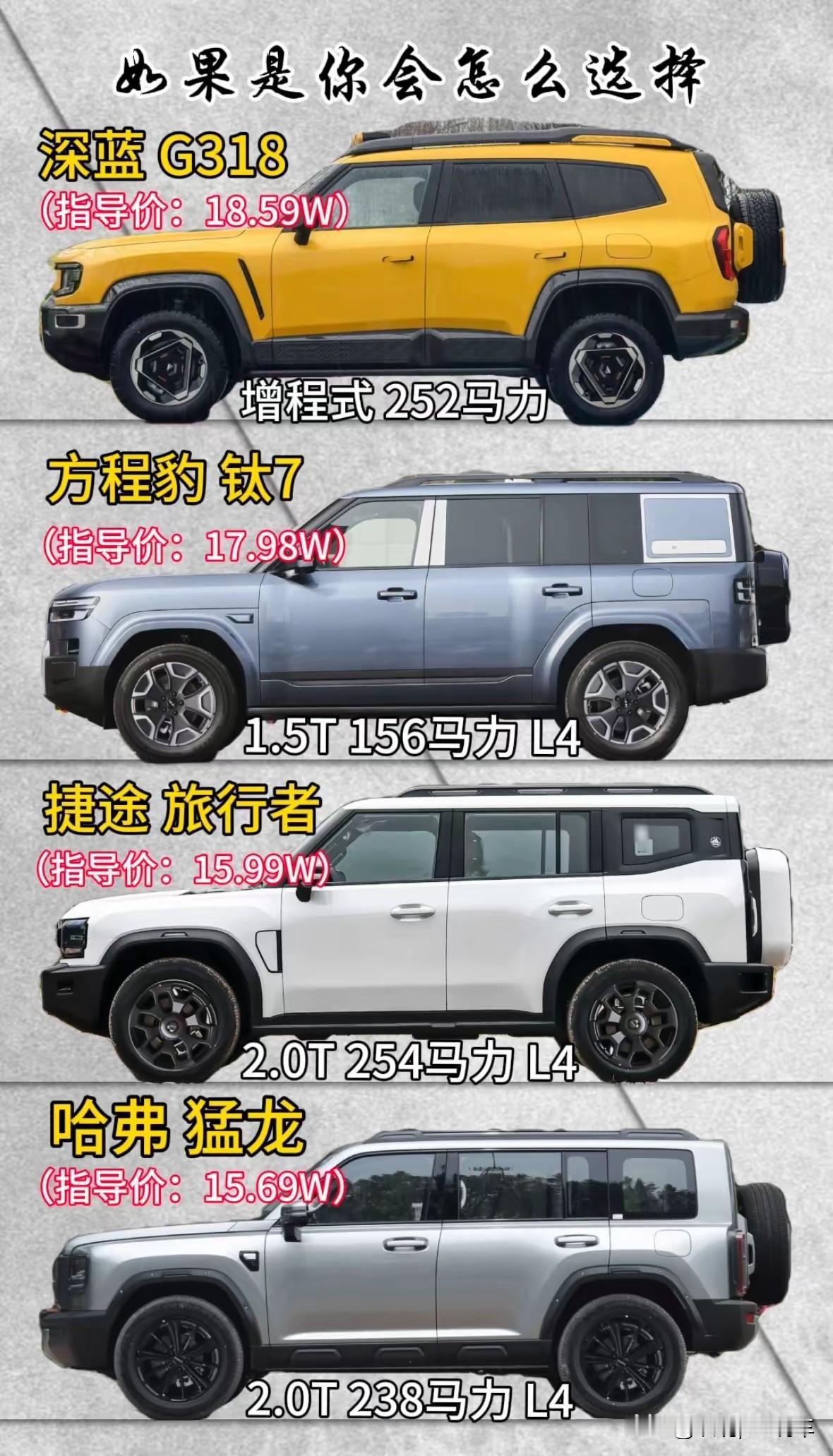 这就是赤裸裸的现实,记住新口诀,选车不纠结: 1、三年不换车——买韩系 2、五年不换车——买日系 3、八年不换车——买美系 4、十年不换车——买德系 5、一生不换车——买国系 15-20万硬派SUV四选一!深蓝G318/方程豹钛7/捷途旅行者/哈弗猛龙怎么选? 15-20万预算想买硬派SUV?这四款热门车型直接把选择困难症逼疯!深蓝G318、方程豹钛7、捷途旅行者、哈弗猛龙,谁才是你的出行搭子?看完这篇直接抄作业!🚙💨 🔋 深蓝G318(18.59W):增程硬派,长途无焦虑 - 核心亮点:252马力增程混动,纯电续航200km,综合续航超1200km,彻底解决硬派SUV油耗痛点。 - 适合人群:喜欢长途穿越、露营的玩家,既能享受纯电通勤的省钱,又能靠增程器征服无人区。 - 加分项:云辇-C智能阻尼底盘+后轮转向,公路操控性在硬派车里堪称越级,兼顾城市代步和越野需求。 🐆 方程豹钛7(17.98W):比亚迪背书,均衡实用派 - 核心亮点:1.5T插混动力,亏电油耗低至6.5L/100km,标配三把锁+坦克掉头,越野能力拉满。 - 适合人群:信赖比亚迪技术、追求均衡表现的用户,日常通勤省油,周末撒野也能打。 - 注意点:156马力的发动机参数不算亮眼,但电机加持下综合动力足够应对大部分越野场景。 🚀 捷途旅行者(15.99W):燃油性价比之王 - 核心亮点:2.0T+8AT黄金动力组合,254马力爆发力强,标配博格华纳四驱+差速锁,机械素质扎实。 - 适合人群:不接受新能源、偏爱纯燃油机械感的玩家,预算有限但想体验硬派越野的首选。 - 加分项:座椅通风加热、L2级辅助驾驶等配置拉满,16万的价格就能拥有20万级的体验。 🦖 哈弗猛龙(15.69W):插混入门首选 - 核心亮点:2.0T插混+Hi4电四驱,纯电续航145km,支持外放电,露营神器属性拉满。 - 适合人群:家用为主、偶尔轻度越野的家庭用户,插混绿牌免购置税,日常通勤成本几乎为零。 - 优势:哈弗多年SUV制造经验背书,维修保养方便,二手保值率在自主硬派车里表现突出。 💡 选车思路总结 - 长途穿越首选深蓝G318,增程技术彻底告别续航焦虑。 - 硬核越野看方程豹钛7,三把锁+坦克掉头专治各种不服。 - 纯燃油性价比选捷途旅行者,机械素质扎实不玩虚的。 - 家用兼顾绿牌冲哈弗猛龙,插混省油还能外放电。 这四款车各有千秋,但都把硬派SUV的门槛拉到了15万级,让普通人也能圆越野梦。你更看重续航、性能还是性价比?评论区聊聊你的选择!👇