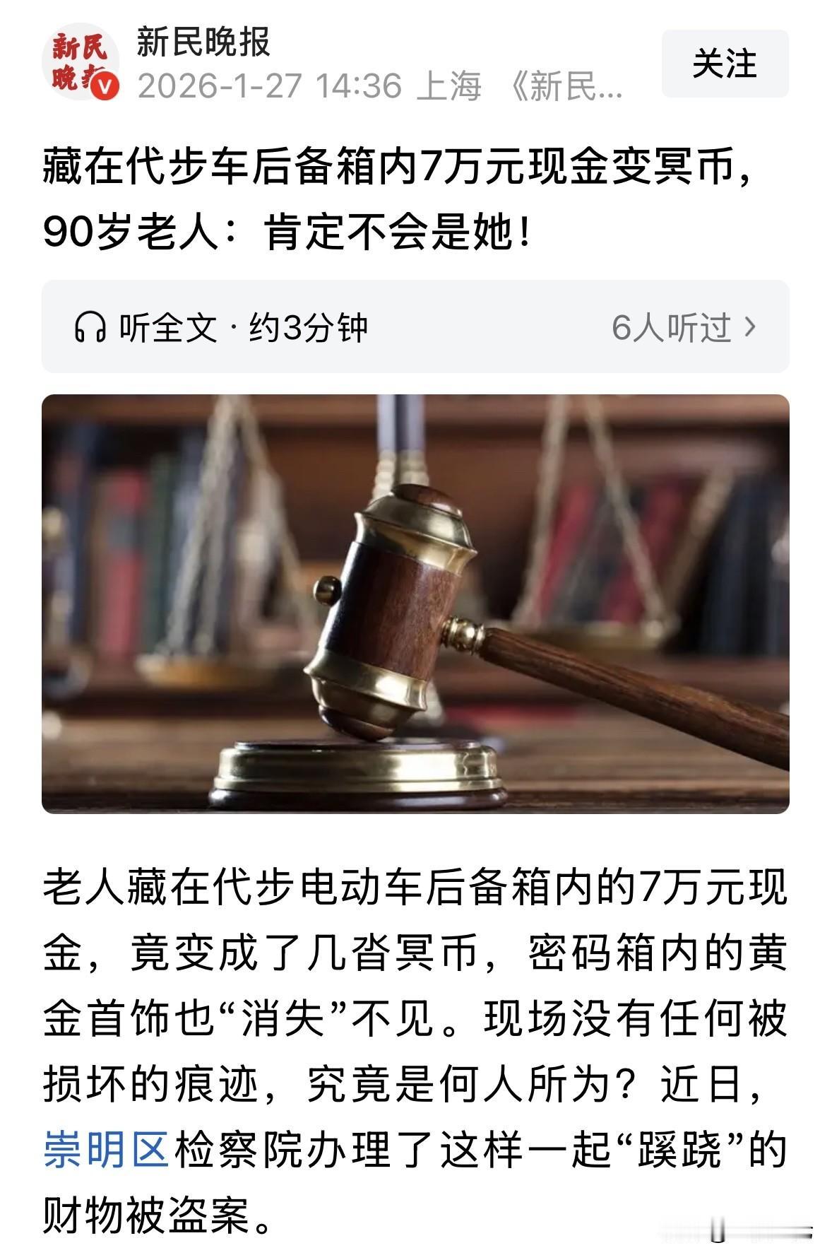 “人心隔肚皮!”上海,九旬大爷在代步车后备箱放了10万现金,却发现其中7万被人换成冥币,他放在密码箱里的黄金项链也不翼而飞,报警后,相处3年的女保姆主动自首,大爷伤透了心,他视保姆如亲人,从没怀疑过她,大爷问保姆为何如此?万万没想到,对方的作案动机,竟是因为吃醋了! 李大爷今年90岁高龄,但身子骨硬朗,耳不聋眼不花,平时出行全靠一辆老年代步电动车。 他这人有个习惯,就是喜欢把钱放在电动车后备箱。这一放就是10万。 这天,他想拿点钱去置办东西。然而,当他打开后备箱,傻了。 他发现,有7万块被替换成了冥币,只剩下3万的真钱。 这还没完,后来,李大爷回家检查放在卧室的密码箱,发现一条沉甸甸的黄金项链也不见了踪影。 李大爷慌忙中分析了一下,这小偷既知道他后备箱里有钱,又知道他密码箱里有条金项链,肯定是他身边之人。 家中平日里只有他和保姆两人,这样看来,保姆的嫌疑最大,但李大爷却笃定,绝对不可能是她! 这个她,就是家里聘请的保姆汪某。 汪某在李大爷家干了整整3年,平时端茶倒水、洗衣做饭,那是尽心尽力。 李大爷对她一百个放心,甚至把她当成了半个亲人。家里这3年从来没丢过一针一线,汪某的人品那是有口皆碑的。 李大爷报了案,但他坚持认为,家里虽然就他和汪某住,肯定不是汪某偷的,她不是那种人。 面对警察的询问,汪某和之前临时顶替过一个月的保姆都说没看见。 可现实还是打脸了。没过几天,汪某自己绷不住了,主动跑去派出所自首了。 这一坦白,把李大爷的心都伤透了。 原来,这事儿还真就是这个贴心保姆干的。但说起作案动机,真是让人哭笑不得,竟然是因为吃醋和危机感。 事情得翻回到6月份。 那时候汪某因为身体不舒服,请假回家休息了一个月。走之前,她怕李大爷没人照顾,还热心肠地帮忙找了个临时保姆顶替。 结果这一个月里,李大爷对临时保姆挺满意,随口夸了几句。 说者无心,听者有意。汪某回来后,心里就开始打鼓了,我才离开一个月,老爷子就喜欢上别人了?是不是觉得我不重要了?是不是要换掉我? 这种莫名其妙的危机感一上头,汪某的脑子就热了。 7月初她回来后,越想越觉得自己吃亏,总想着这三年不能白干,得给自己留条后路。 于是,趁着李大爷不注意,她把那密码箱里的金项链和一枚金戒指给顺走了。 接着,她又盯上了代步车后备箱里的10万现金。 这里有个细节特别讽刺。汪某交代,她偷钱的时候,心里其实还在做斗争。 她想着老爷子平时也要花钱,不能全拿光。于是,她只拿了7万,留下了3万。 那拿走的7万怎么处理?为了不让李大爷马上发现,她想了个绝户计,用冥币顶替! 她找来报纸,把家里没用完的冥币包得跟真钱一样,塞进了后备箱,企图制造钱还在的假象。 她以为这事儿能瞒天过海,毕竟李大爷年纪大了,可能不会天天去数钱。 可她没想到,李大爷虽然90岁了,但对自己的钱心里跟明镜似的,一上手摸厚度、看颜色,立马就发现了不对劲。 更荒唐的是,汪某偷了金首饰后,因为害怕被发现,压根就没敢带出李大爷的家门,而是藏在了三楼的一个抽屉里。 面对警察,汪某哭得一把鼻涕一把泪,说自己是一时糊涂,把李大爷当亲人才没把事做绝。 李大爷虽然气得够呛,但毕竟3年的感情摆在那,看着汪某悔恨的样子,老人家心软了,还专门写了谅解书,求法院轻判。 经鉴定,被盗的黄金首饰值2万多块钱,加上那7万现金,数额不小。 2025年11月,检察院把汪某告上了法庭。 考虑到她有自首情节,而且钱和金子都没来得及挥霍就被追回来了,属于犯罪未遂,再加上李大爷的谅解,法院最后判得还算有人情味:有期徒刑二年,缓刑二年六个月,还要罚6000块钱。 这判决意味着汪某不用真的去坐牢,但留下了案底,还要接受社区矫正,这辈子算是有了污点。 这案子看完,真是让人唏嘘。李大爷拿真心换真心,把保姆当家人,结果保姆却因为一点莫须有的危机感就下黑手。 汪某的行为,就是贪婪加上小心眼。她觉得自己付出了3年,一旦感觉地位动摇,就想通过非法手段找补回来。 她以为留下3万块、没把金子带出门是手下留情,其实在她伸手的那一刻,这3年的情分就已经彻底断了。 好在法律是公正的,虽然缓刑给了她改过自新的机会,但这6000元罚金和刑事案底,够她记一辈子的。 对于这件事,你怎么看? 欢迎关注@一案一论