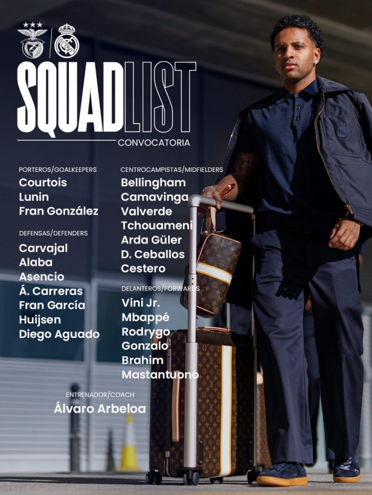 皇马本场比赛大名单如下: