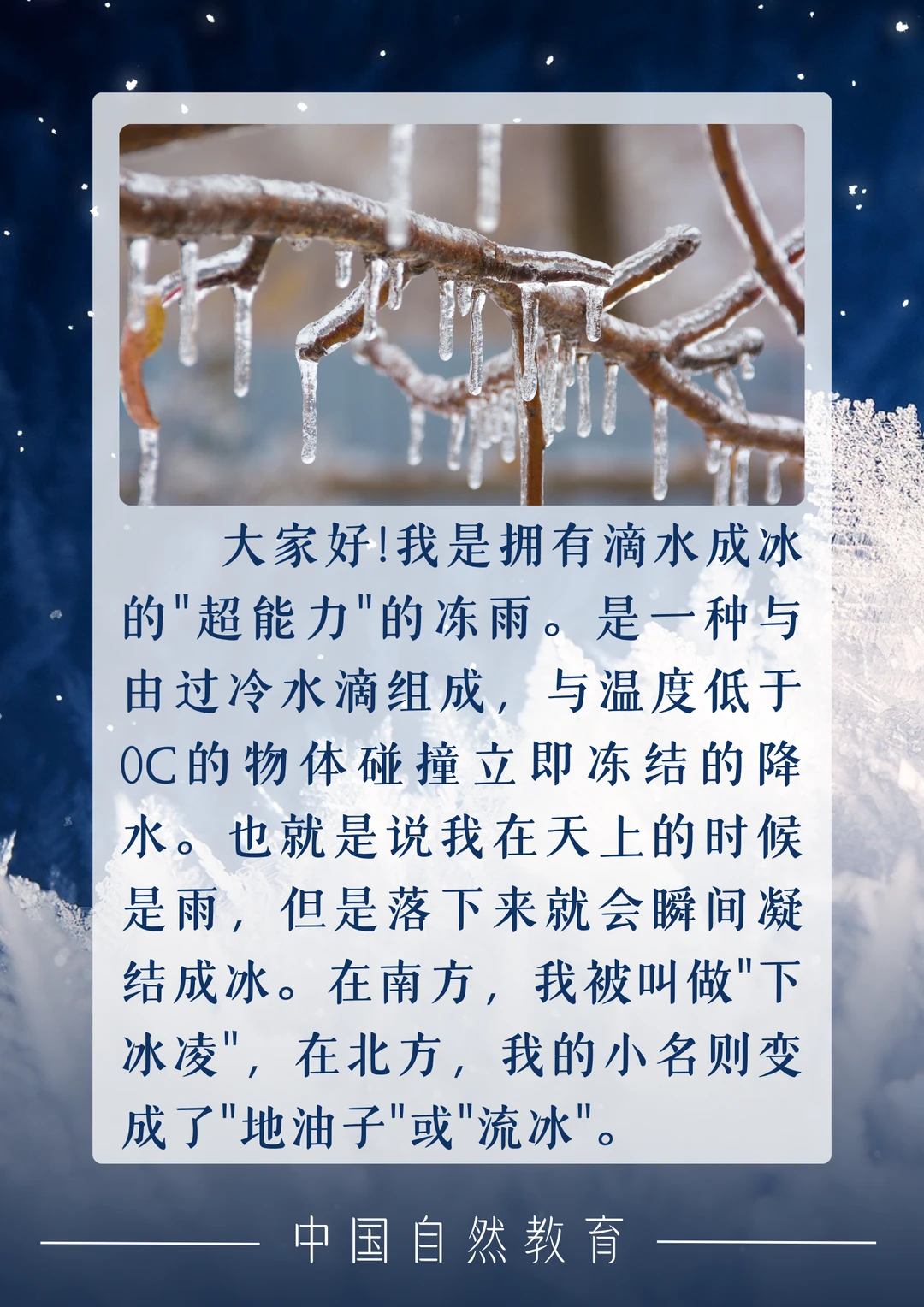 冻雨是过冷雨滴(温度低于0℃但未冻结成冰)在降落过程中遇到温度低于0℃的物体,迅速冻结成冰,即天上是雨,落地成冰。