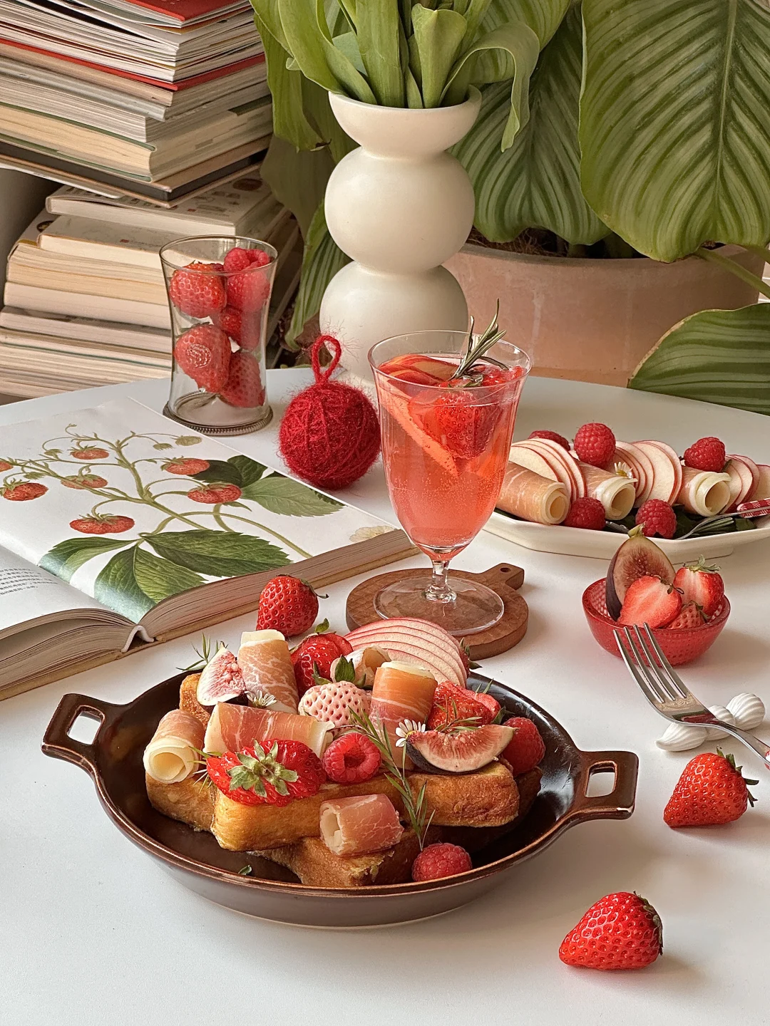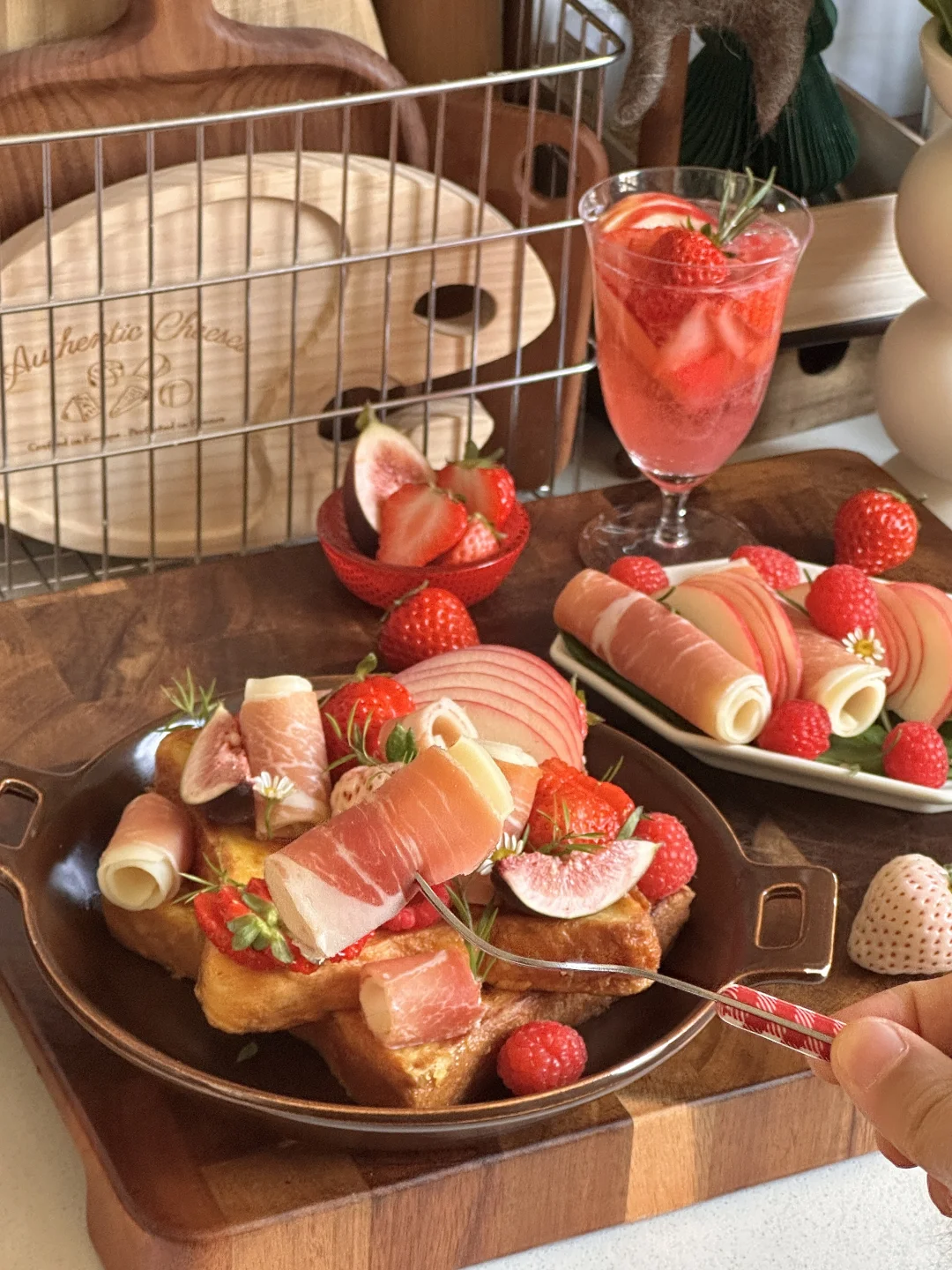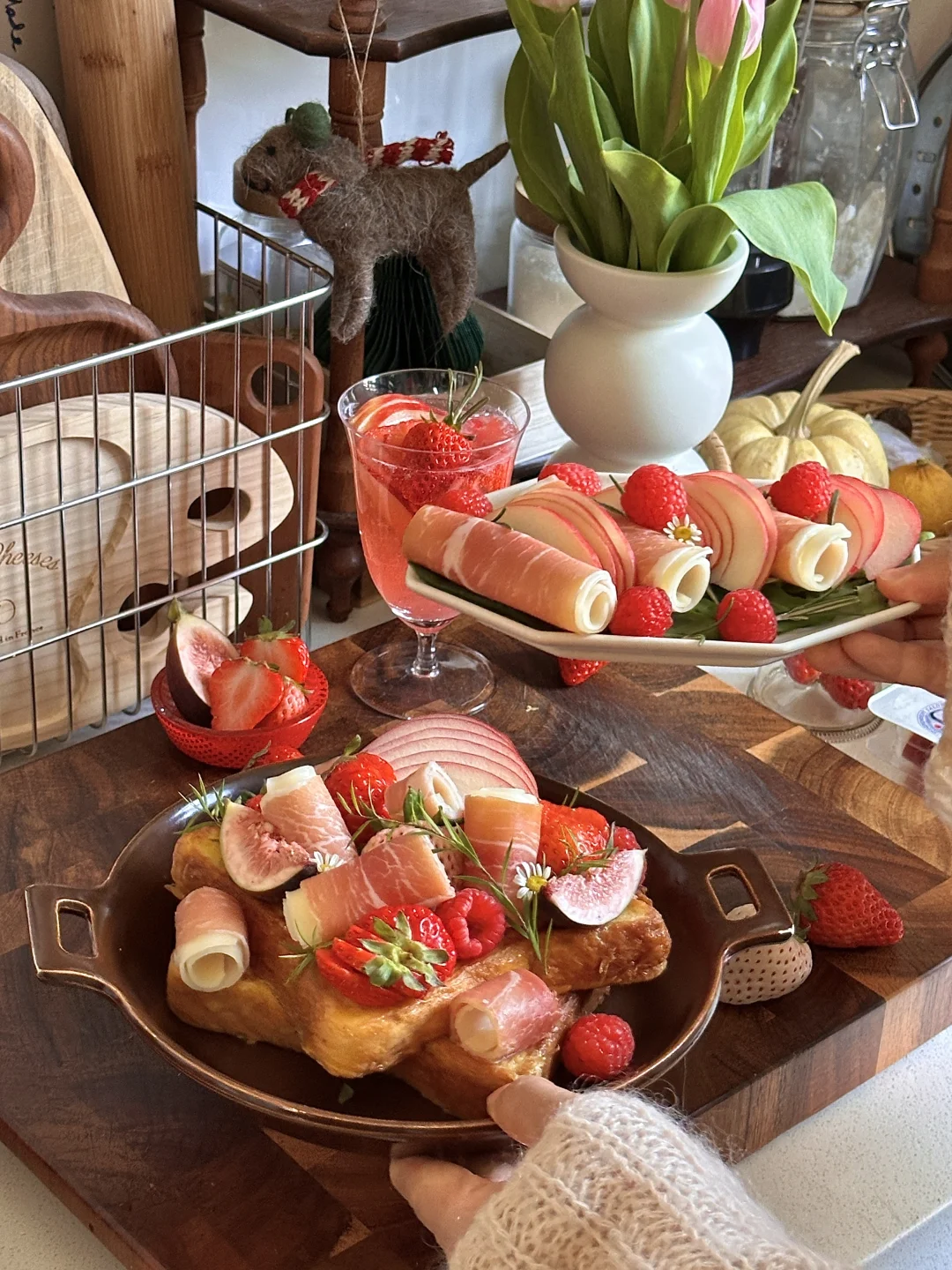 ·将吐司摆入盘中,摆上火腿奶酪卷,空隙处摆上切片苹果与草莓、无花果、树莓🍓,再装饰一些香草🌿