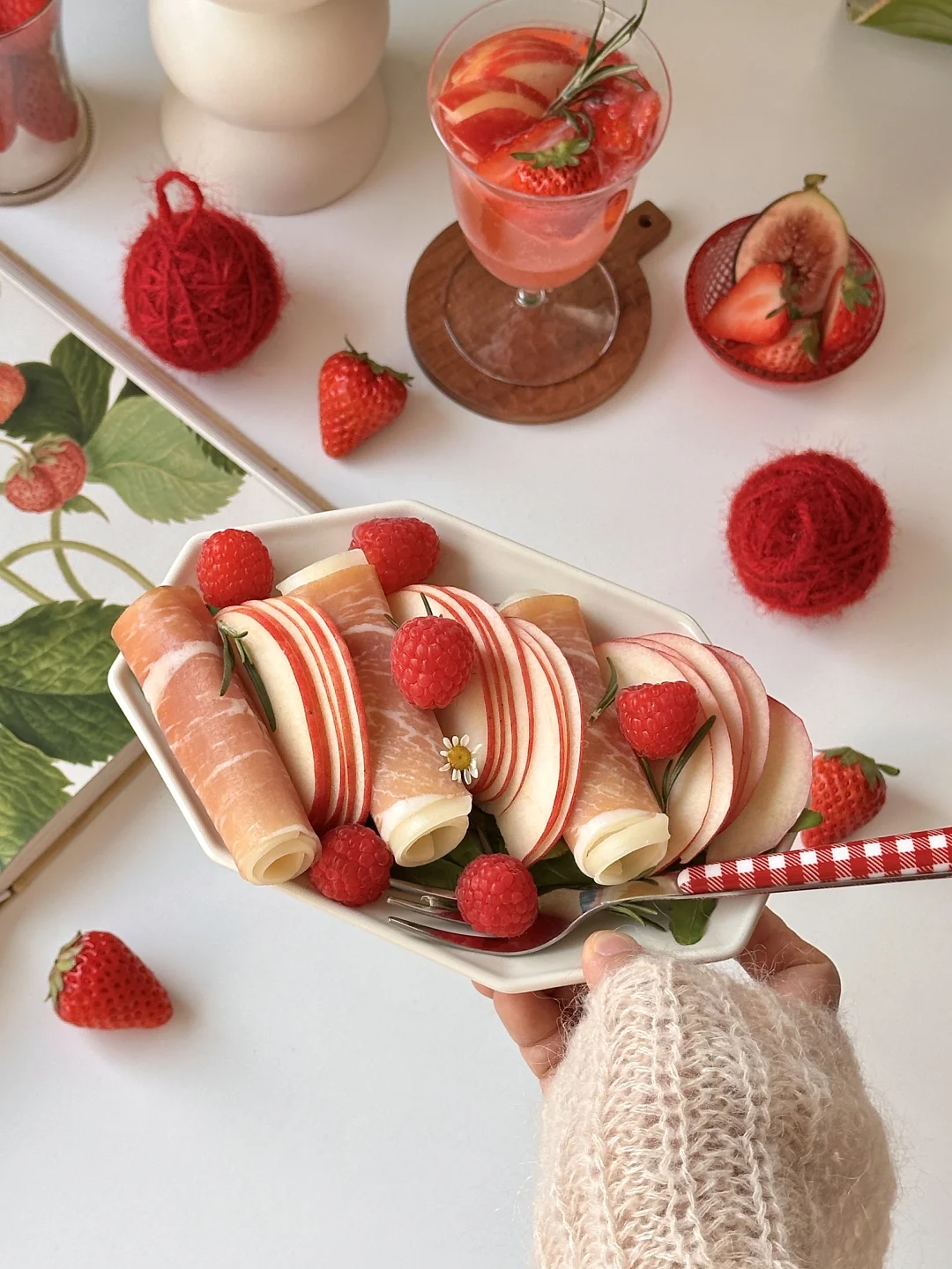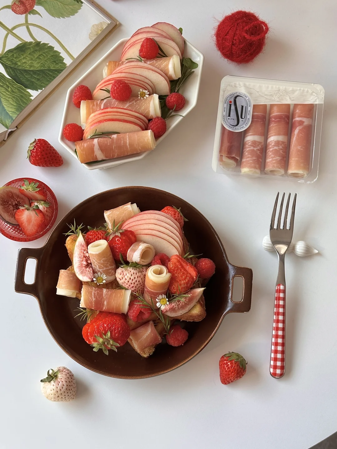 🥓剩下的苹果片与火腿奶酪卷、芝麻菜与浆果🍓拼拼凑凑成奶酪小食拼盘🫕