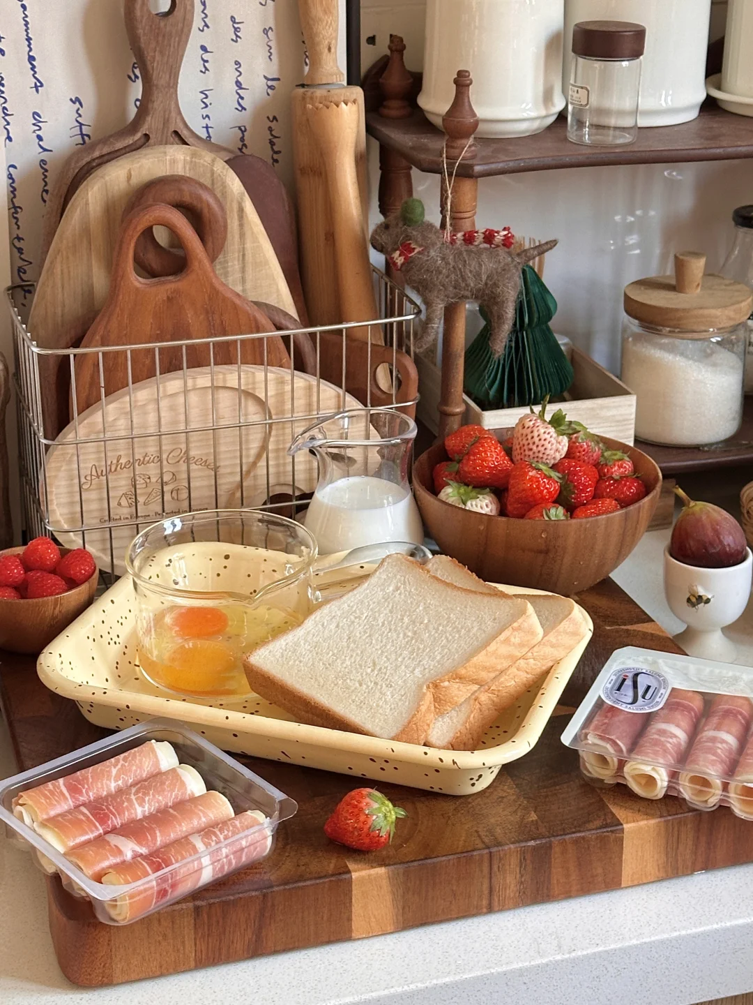 吐司|鸡蛋2个|牛奶|火腿奶酪卷|黄油|苹果|无花果|草莓|树莓
