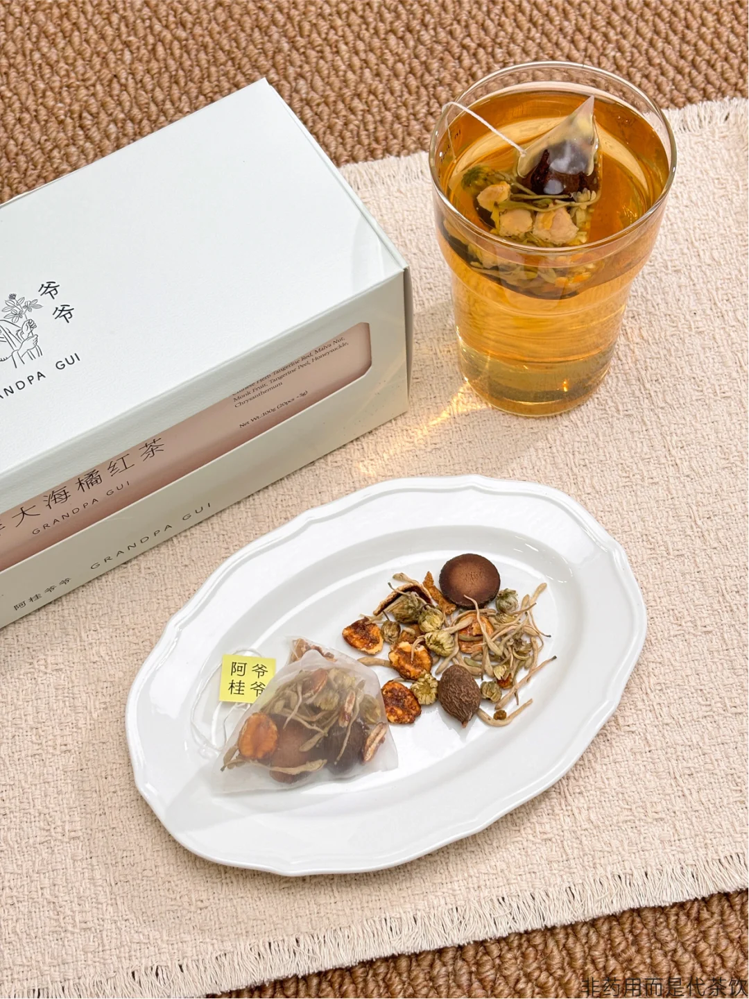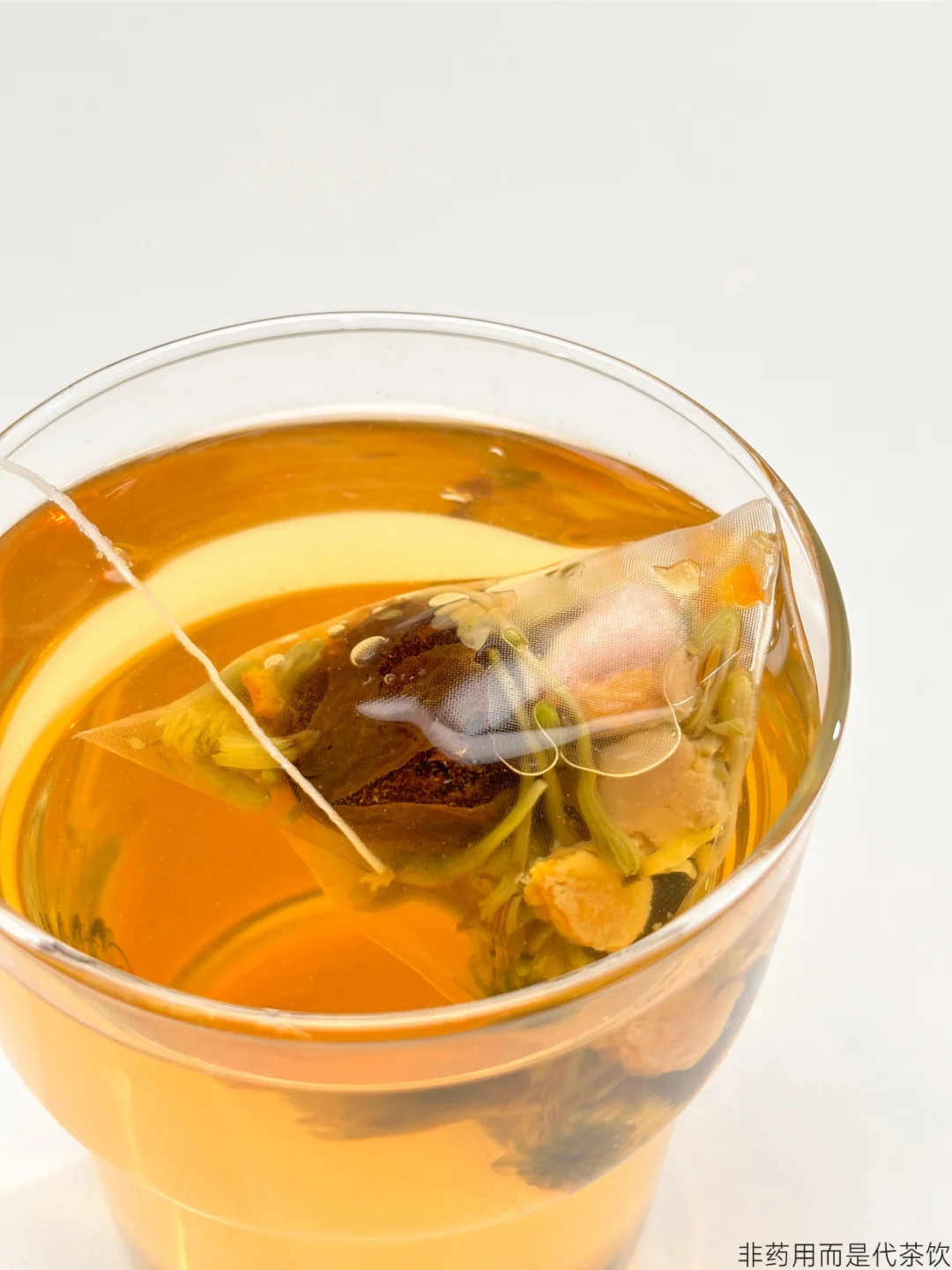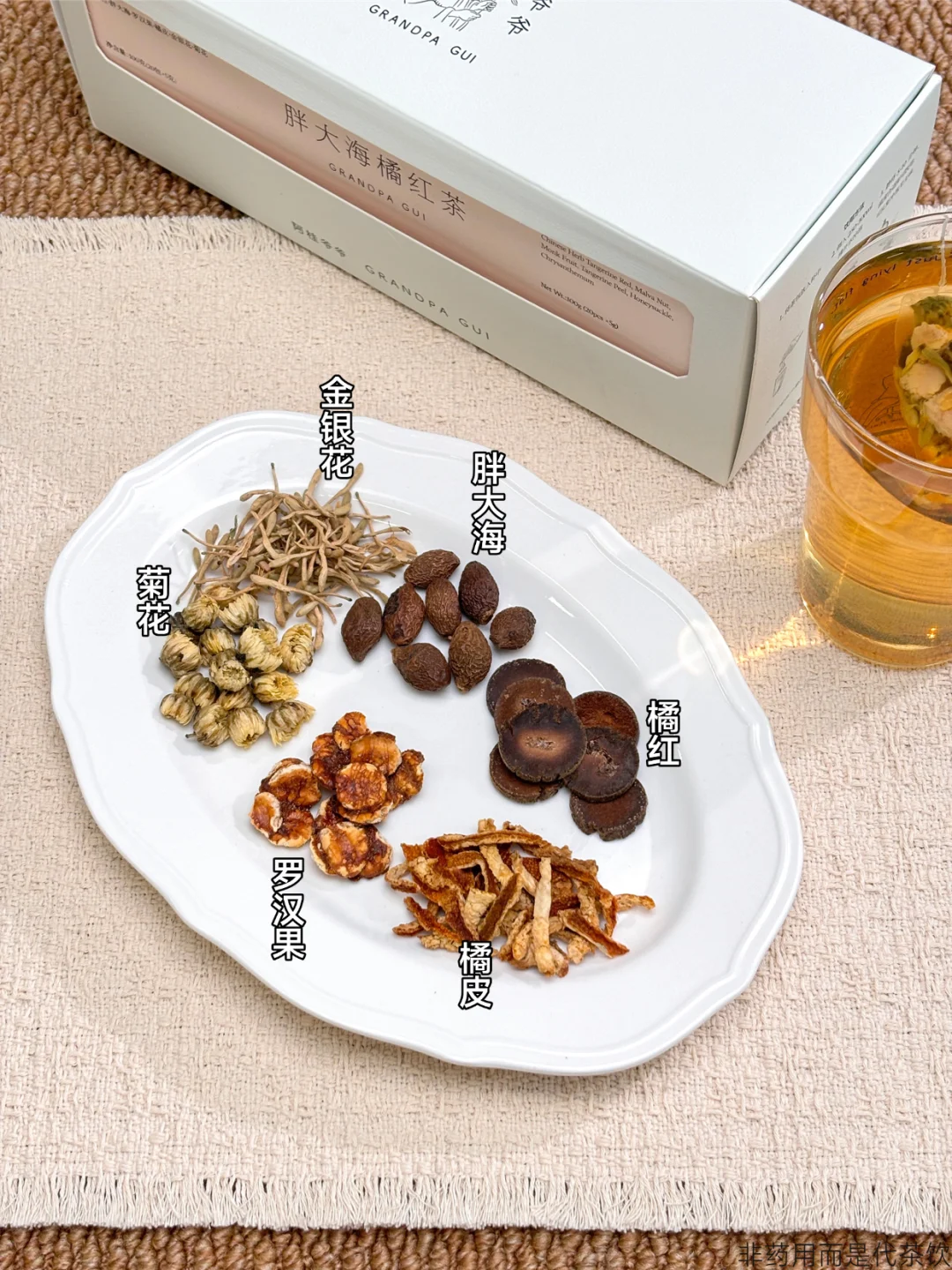 橘红舒缓痰感,罗汉果增添自然甘甜,再加上金银花、菊花的清新,还有用橘皮调和整体风味,形成口感丰富的滋润茶汤。