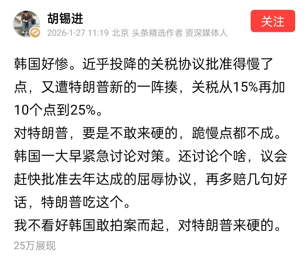 胡锡进、张维为二位先生观点一致。 1月27日,胡锡进先生谈到川普的关税大棒又一次对准了韩国,并认为韩方是不敢对川普来硬的。 前几日,哥伦比亚大学萨克斯教授拜访了复旦张教授,两位教授在川普对待大国、小国的态度上是一致的,即川普尊重强者,欺负弱者。 如今,关税大棒再次挥向韩国,恰恰又是一次实证。从很多事例都可以看出,特朗普这个人的慕强心理很强。张维为教授在视频中说道,特朗普对大国目前仍保持相对尊重的状态,这便是当前的世界局势。
