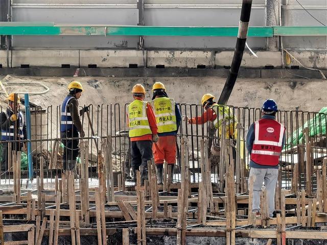 施工现场,建设者正在进行最后一道长约20米的冠梁支撑混凝土浇筑。竹叶山站位于发展大道与黄埔大街交叉路口,为地下二层岛式车站,共设3个出入口、2组风亭,未来将与已运营的8号线经过通道实现换乘。