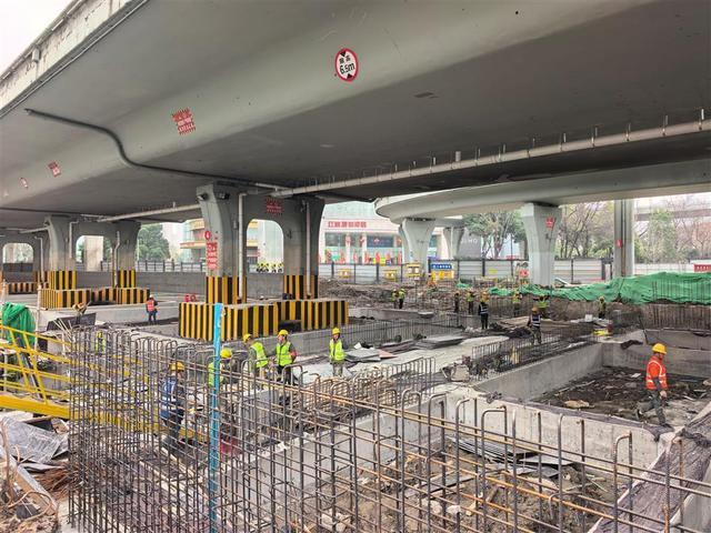 据介绍,该车站地处长江一级阶地,且位于二环线高架桥正下方。车站基坑内涉及7组高架桥墩,基坑外开挖影响范围内更有约20组桥墩,桥下净空高度有限。施工需要同时克服复杂地层结构和低净空施工风险。