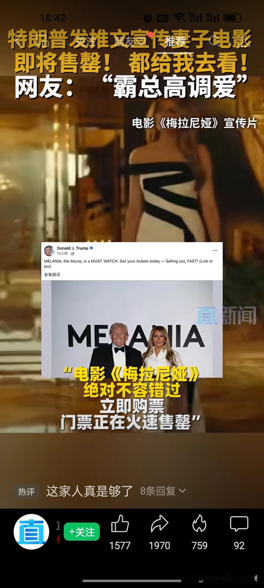 特朗普夫妇又搞钱了?这次是把“第一夫人”拍成电影卖票! 特朗普当总统真的是将自己家族利益最大化为己任,今天还发文帮妻子卖电影票。特朗普刚发推文喊话“都给我去看《梅拉尼娅》,票快卖光了”,网友笑称这是“霸总宠妻式圈钱”。 从房地产、加密货币到高端手表,帽子,T恤,特朗普家族的赚钱版图早已遍布各行各业,连加州州长纽森都吐槽他上任一年狂赚15亿美元,现在看来这个数字可能还太保守。 更有意思的是,不少网友玩梗:“要是哪个国家不引进这部电影,会不会被加关税?”毕竟在特朗普的字典里,生意和政治从来都不分家。