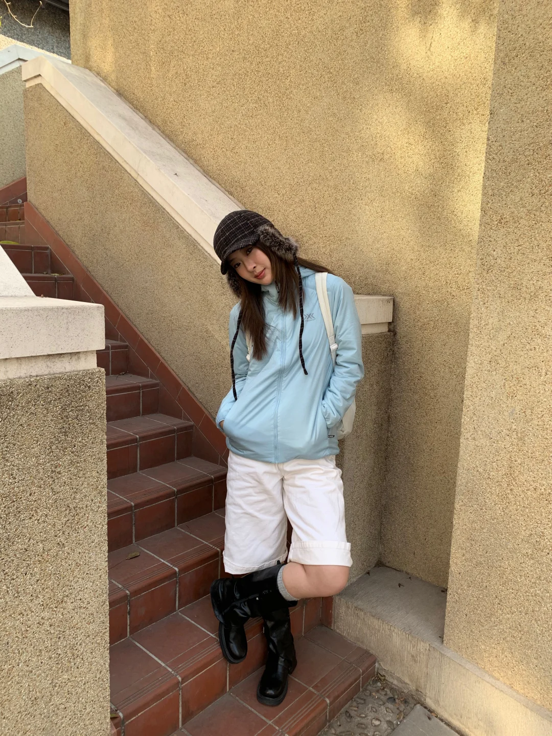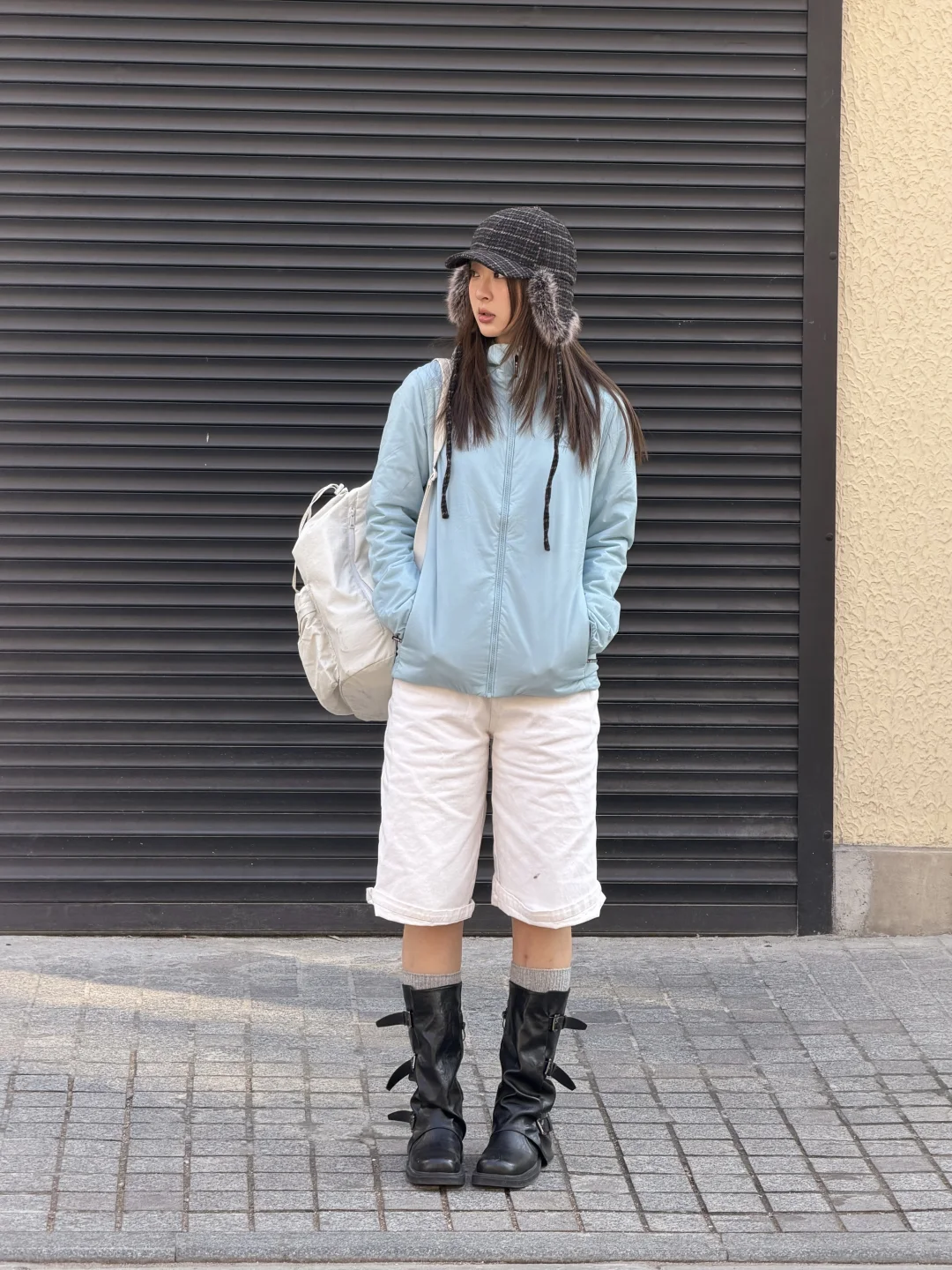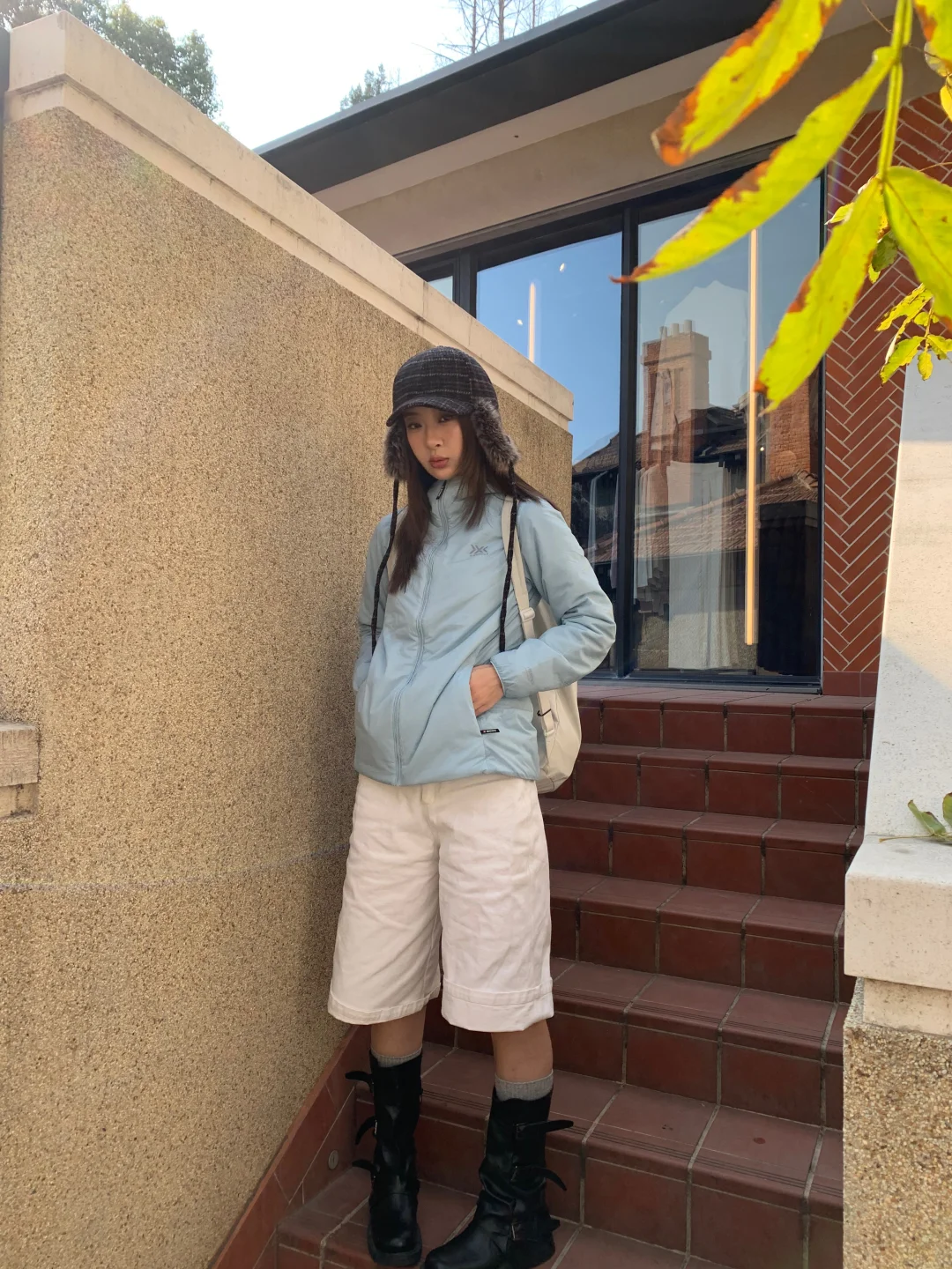 搭配牛仔中裤和中筒靴