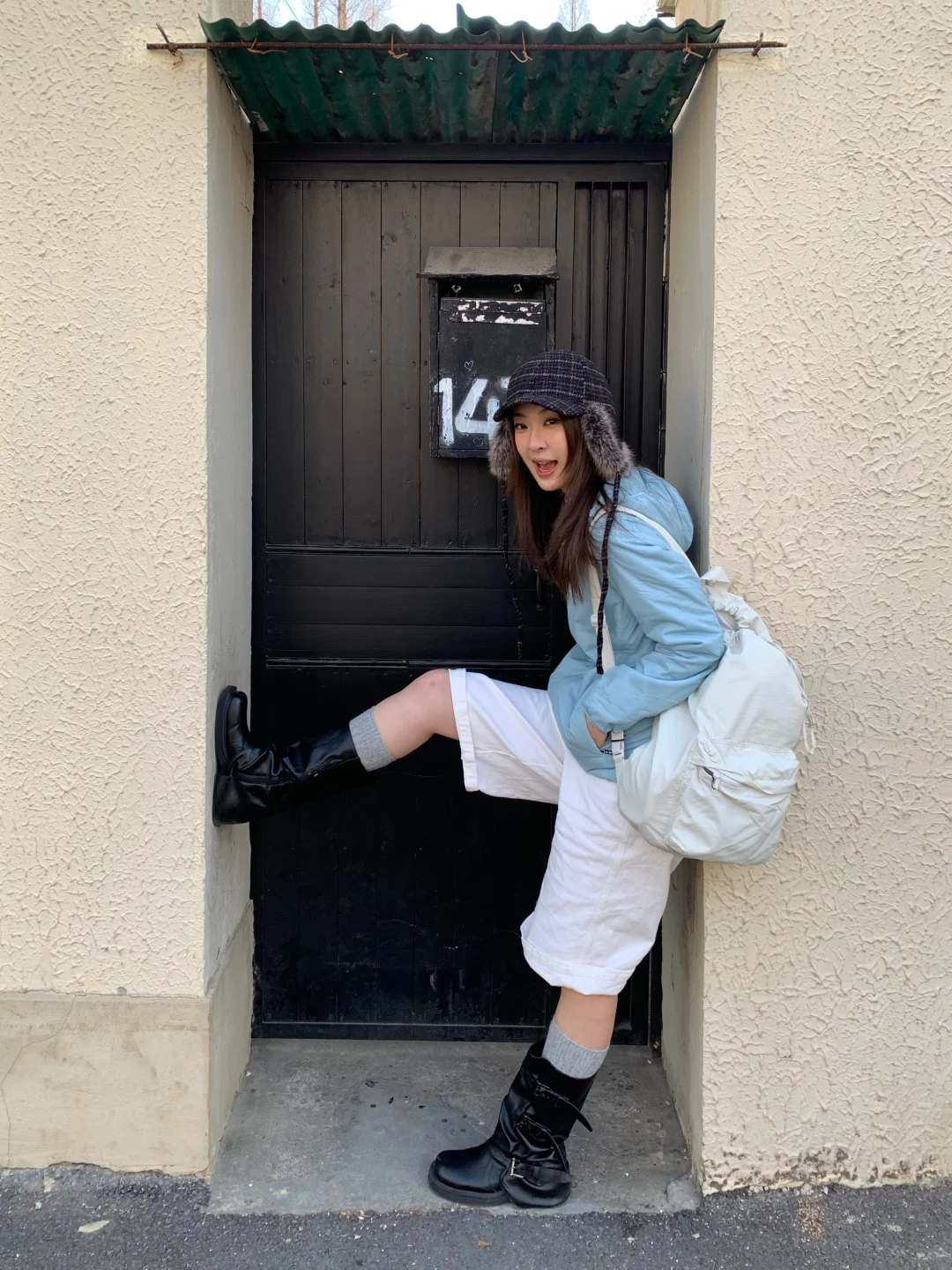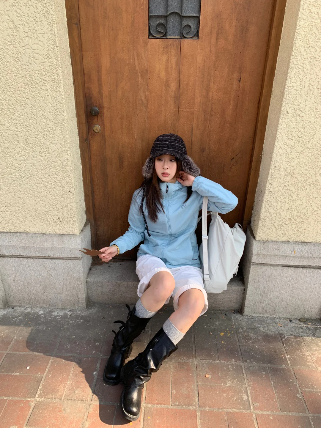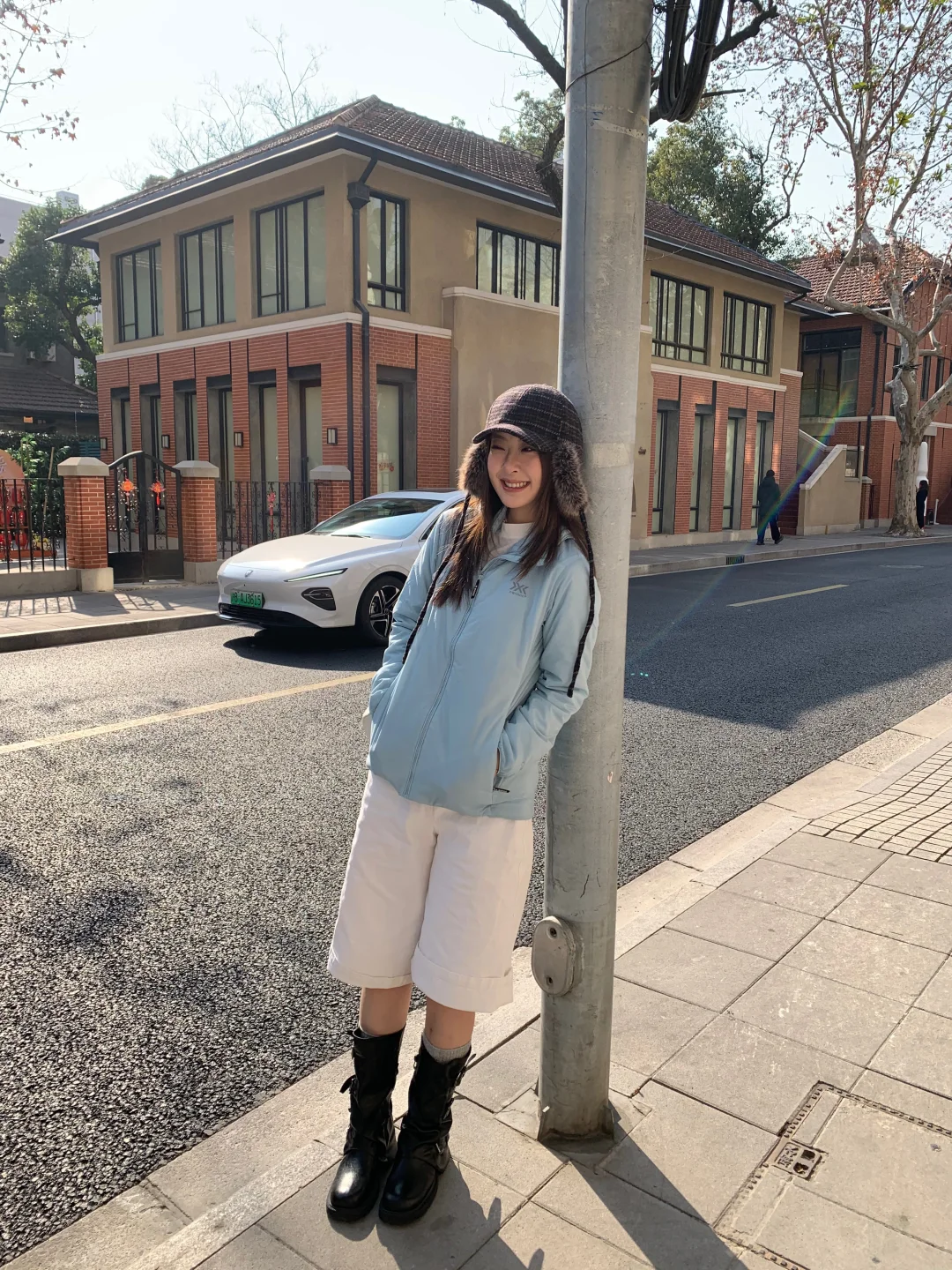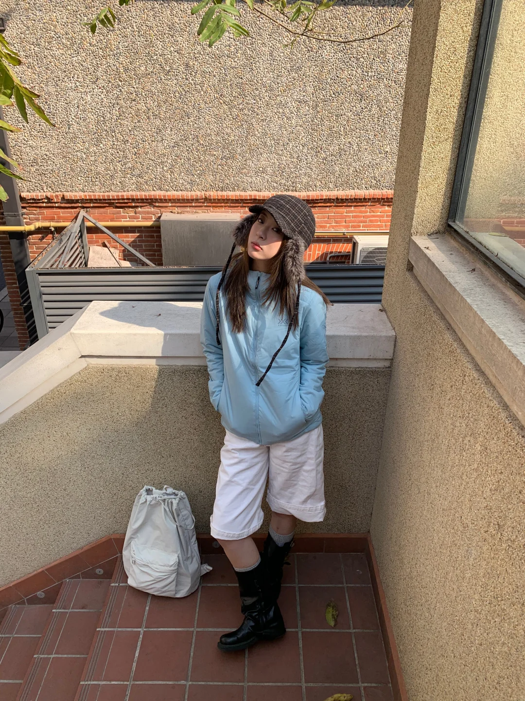 搭配牛仔中裤和中筒靴