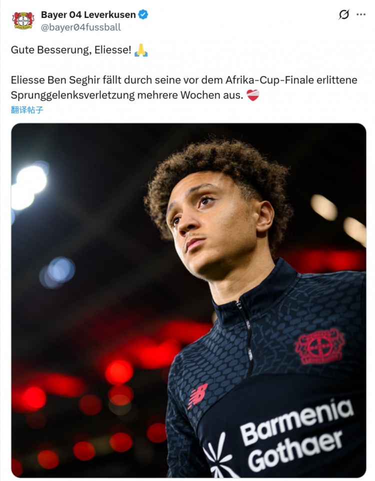 本·塞吉尔随摩洛哥国家队参加非洲杯,但因伤缺席决赛。勒沃库森确认,这位20岁的边锋在非洲杯决赛之前脚踝受伤,将缺阵数周比赛。