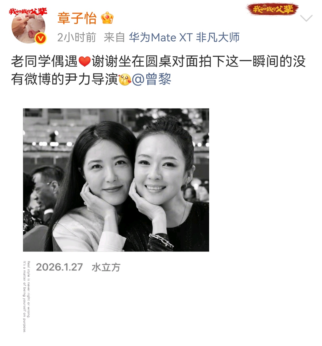 章子怡偶遇老同学曾黎 章子怡偶遇中戏老同学曾黎,并在微博分享了由导演尹力拍摄的两