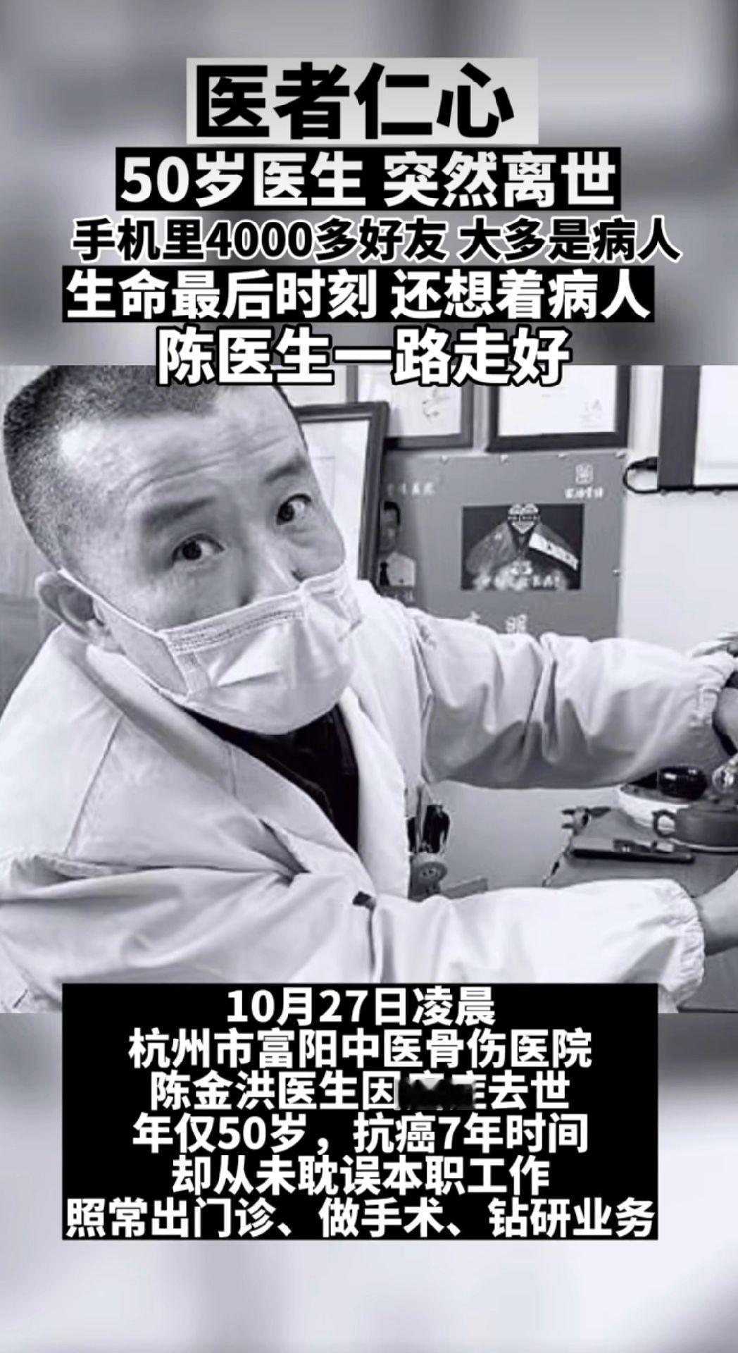 今天看到一个新闻,50岁骨科医生陈金洪肝癌复发离世,说实话,看完之后真的是意难平。同为医生,我特别能理解他,理解他为什么自己身患癌症却依然坚守岗位。医生有医生的责任,医生也有我们自己的“小心思”:也许再坚持坚持,又能够多救一个。有时候我们舍不得多刨一口饭,可能我们能多听患者说一句病情;有时候憋一憋,少上一次厕所,也许就能多诊断一位患者;有时候再晚一点下班,让我看一下,再看一个……我们都是同样的在妥协着,也在抗争着。不同的是,我们的对手只是一些琐事,而你的对手却是癌症;我们的妥协总是有一个期限,而你却没人再给时间。同为医生,我对你有的是敬仰,但更多的总是遗憾。敬仰的是你的坚持,遗憾的是未曾相见却又无缘相见。 陈医生,一路走好。肝病 怀念 陈金洪