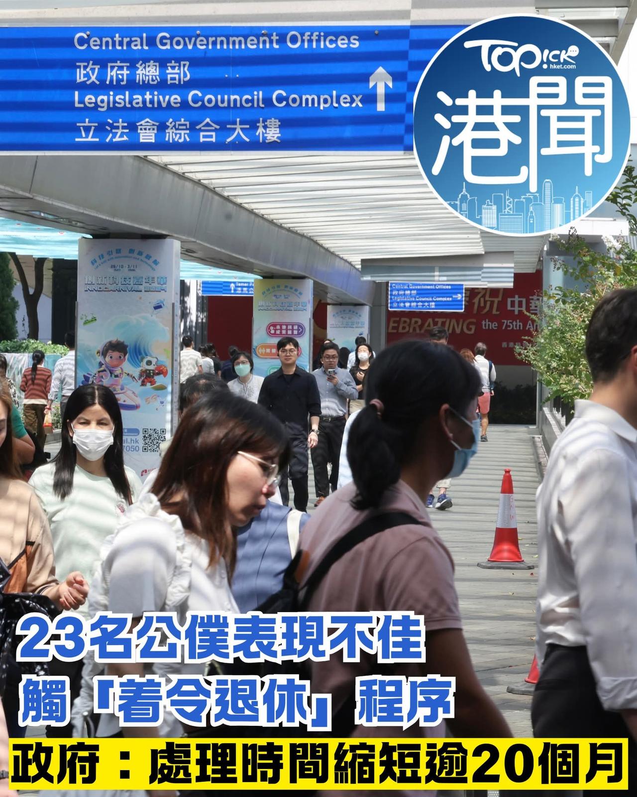 23公务员表现欠佳 4人已被着令退休 公务员表现近年受社会关注。公务员事务局向立法会提交文件指,局方自2023年9月根据《公务人员(管理)命令》第12条,为公众利益着令工作表现持续欠佳公务员退休的简化机制。截至本月中,共有23名公务员触发机制。 局方表示,23名触发机制的公务员中,4人已被着令退休;2人于收到通知书后离职;4人的表现提升至可接受水平因此「第12条行动」获暂缓,但仍处于三年监察期中;13人的个案仍在进行中。此外,部分人员得知部门打算对他们进行「第12条行动」,在进入「观察期」前已自行辞职。简化机制后,平均处理时间由31个月大幅缩短至10.5个月。 文件又提到,公务员事务局目标在今届政府内共减少一万个公务员编制,预计至今年3月31日,公务员整体编制将会下降至约19.3万个职位,即累计减少约3000个编制。另外亦正研究优化工作表现评核机制,以配合去年《施政报告》提出成立的「部门首长责任制」。 高sir:十分支持,夏主任在专题研讨会表示,公务员维护行政主导义不容辞是「局中人」,要切实为民众办实事、解难题,赢得市民对政府工作的大力支持和广泛参与,以实际行动和工作成效展示自身的忠诚履职,不达标者,应该清除。