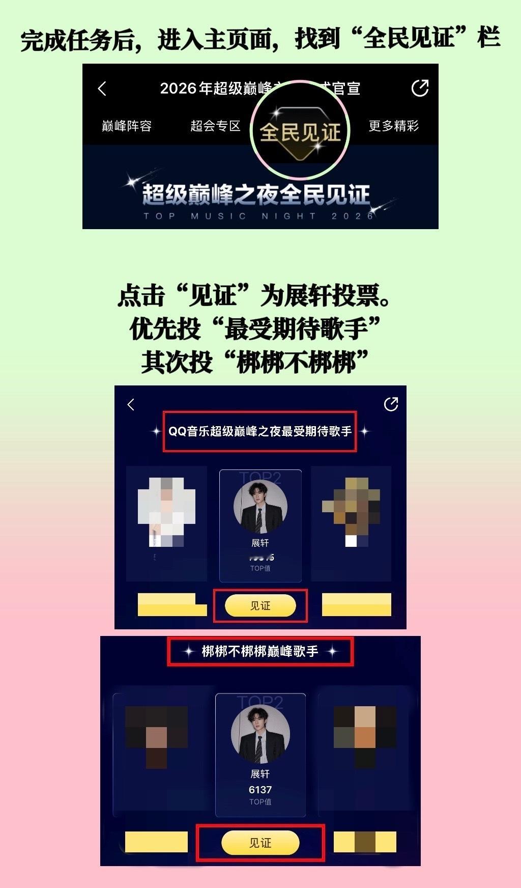 展丞 💖💚展丞万事顺意来日方长 大家都来动动小手投一下🎫!主投QQ音乐超级巅峰之夜最受期待歌手【展轩】☝🏻看到的一起kk! 🧱这条抽一套28张展轩星光卡【1-4星全】和一只展小歪,兑奖需提供连续三天投🎫录屏2月1日9:05开 抽奖详情