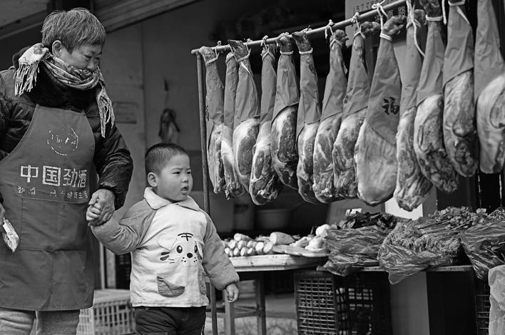 昨天,在市区洪波路上的一家土特产店铺门口,商家将过年用的腊猪腿用喜庆的红纸包上并贴上福字,诱人的肉香加上大红的福字让禾城的新年味道渐渐浓厚了起来。