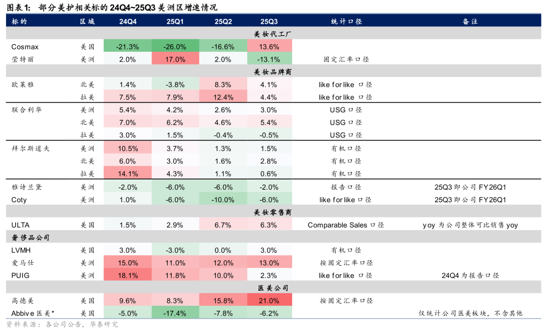 美国市场美妆/医美中小玩家业绩分化进一步显现,整体增长韧性弱于头部零售商。ELFFY26Q2剔除Rhode品牌收购等因素的营收有机增速为-3%,主因定价调整影响出货节奏。Coty自FY25Q1以来美洲营收连续5季度下滑(报告口径,下同),FY26Q1美国化妆品市场销量承压。BBWI25Q3营收yoy-1%,消费者信心持续下降导致其美国市场增长停滞,美/加直销渠道营收录得yoy-7%。医美方面,美国高单价资本设备需求降温较显著,InMode25Q3营收yoy-28%,耗材与服务业务增长难以弥补设备销售疲弱;艾尔建业绩会中称美国消费者信心偏低,其肉毒/填充剂营收均同比下滑。