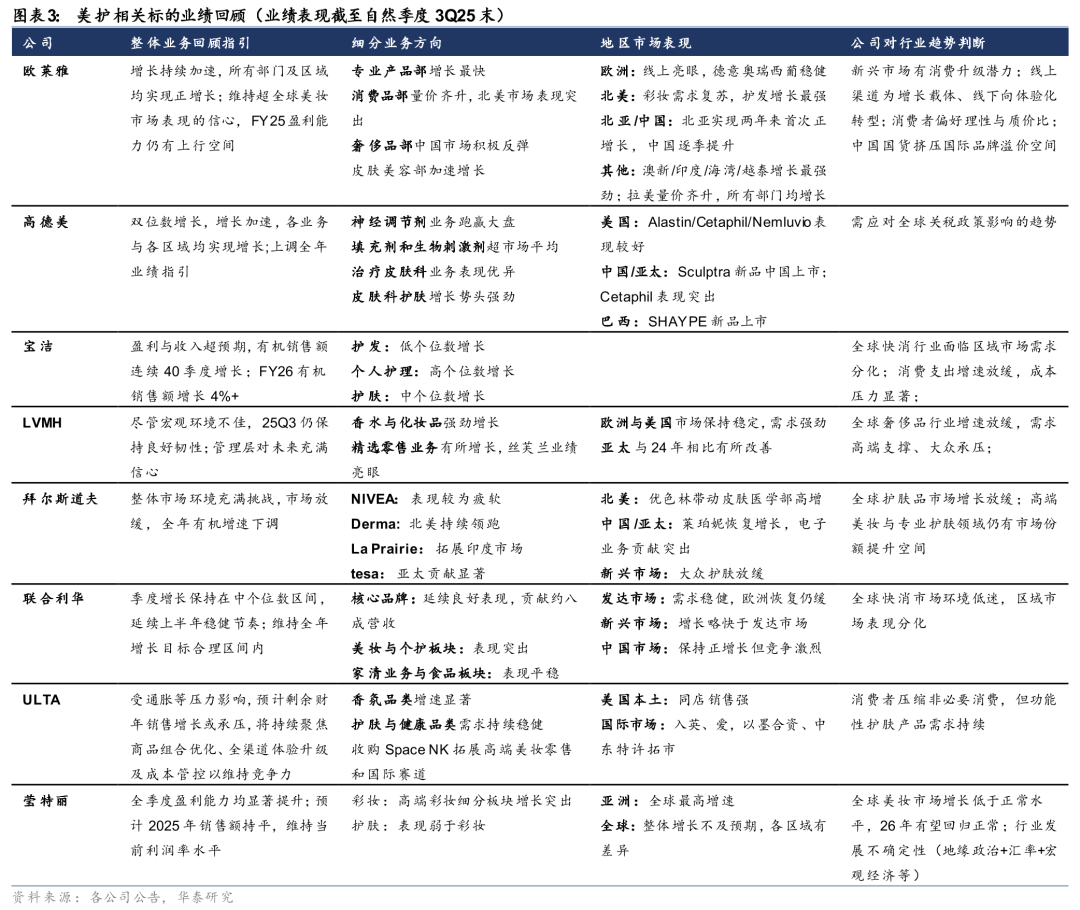 25Q1-Q3美国高端/大众美妆市场yoy4%/5%(据Circana),其中大众香水香氛增长最强劲,而剔除此品类,高端整体表现较大众更优;消费者正压缩“非必要型”消费支出(Ulta),但美妆标的并未演绎出简单的“Tradedown”,品牌商尤为如此。ELF(平价彩妆)/BBWI(个护香氛零售)/Interparfumes(香氛)/科蒂(美妆)等中小玩家及若干医美企业(InMode/AllerganAesthetics等)业绩会中均提及美国市场整体疲弱;雅诗兰黛正努力恢复在美流失的市场份额;K-beauty在美表现突出。零售端,Ulta同店增长表现突出/上调指引;与此共振的是,大众零售(沃尔玛等)/折扣零售(TJX/ROSS等)/美元店(DollarTree等)线下零售商近期股价亦突出。