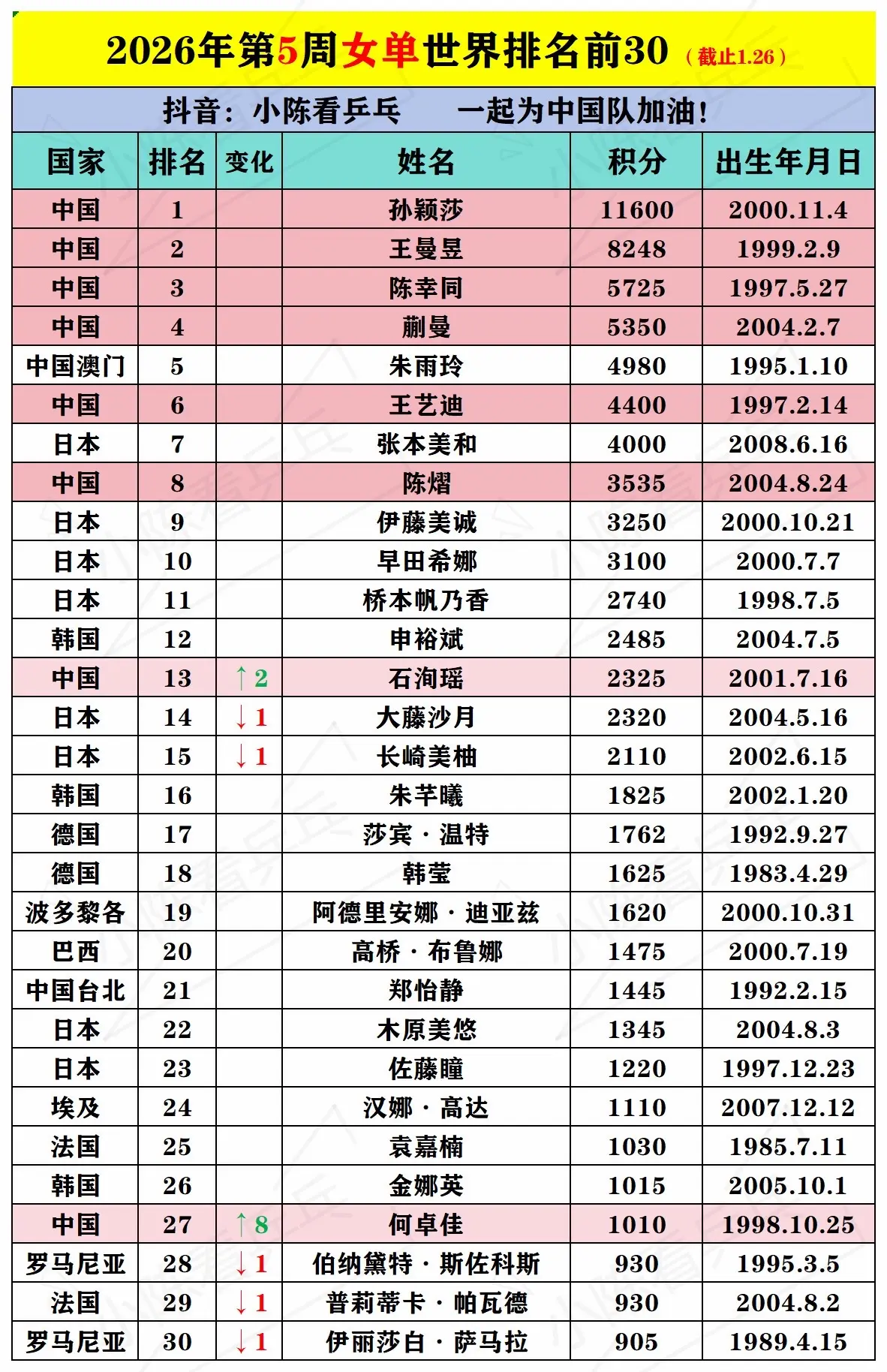 2026第5周乒乓球单打世界排名前30。2026第5周乒乓球单打世界排名前30列表,中国队继续加油。