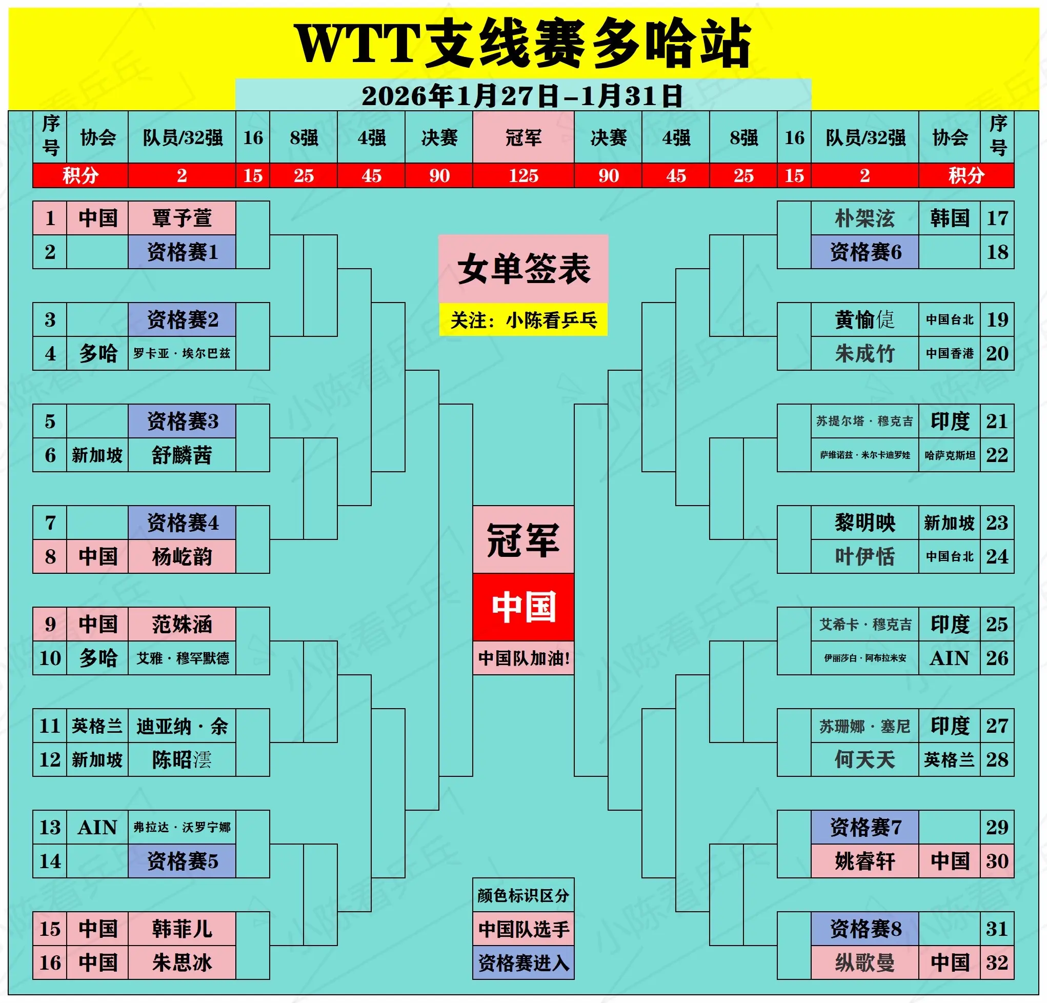 WTT多哈支线赛正赛签位图。WTT多哈支线赛正赛签位图,待资格赛入位更新完整签位,中国队加油。