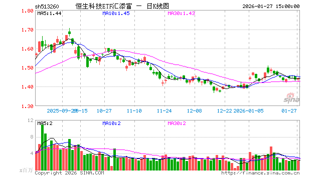 1月27日,恒生科技ETF汇添富(513260)涨0.63%,成交额3.17亿元。当日份额增加100.00万份,最新份额为52.24亿份,近20个交易日份额增加1.09亿份。最新资产净值计算值为75.80亿元。
