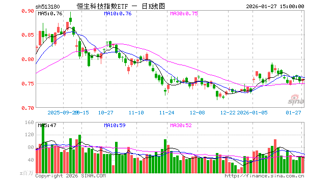1月27日,恒生科技指数ETF(513180)涨0.66%,成交额38.32亿元。当日份额增加800.00万份,最新份额为697.77亿份,近20个交易日份额增加32.81亿份。最新资产净值计算值为530.72亿元。
