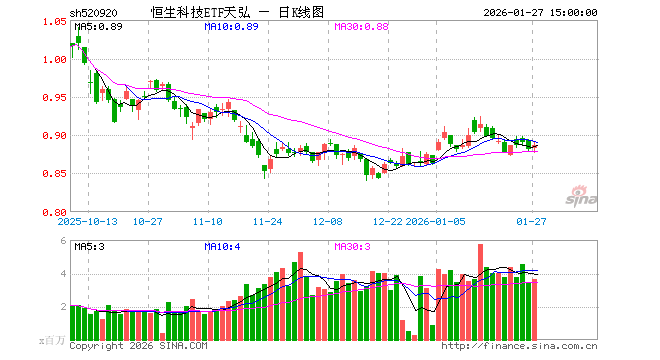 1月27日,恒生科技ETF天弘(520920)涨0.68%,成交额3.22亿元。当日份额增加2.00亿份,最新份额为158.09亿份,近20个交易日份额增加37.90亿份。最新资产净值计算值为139.74亿元。