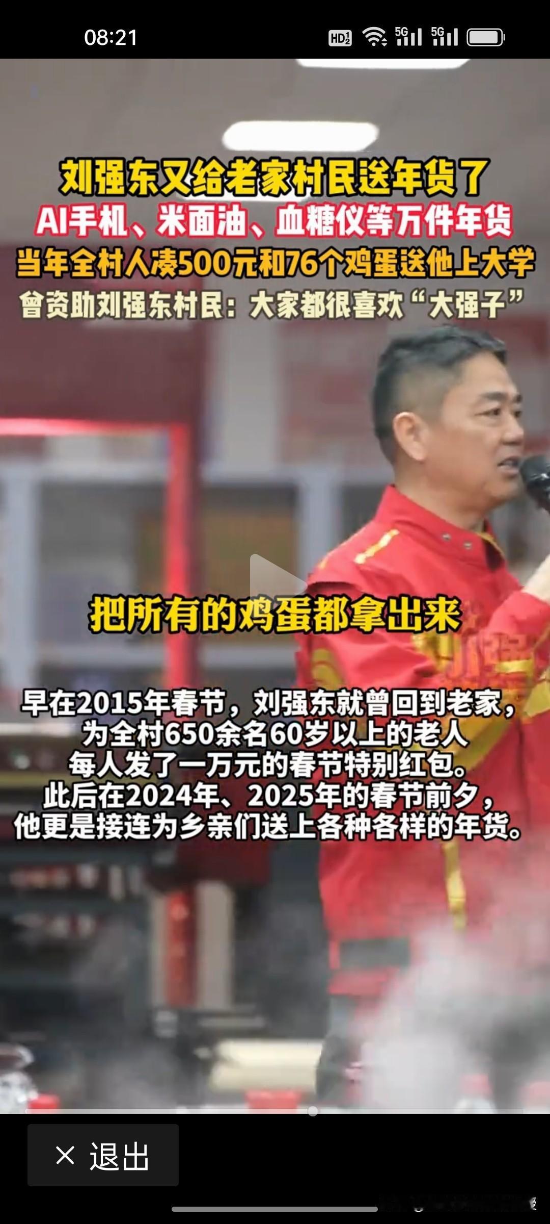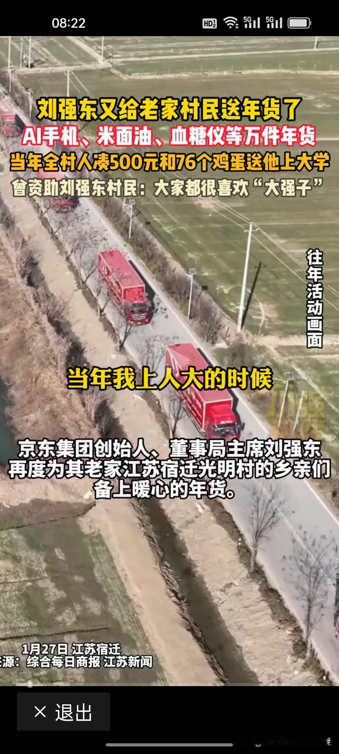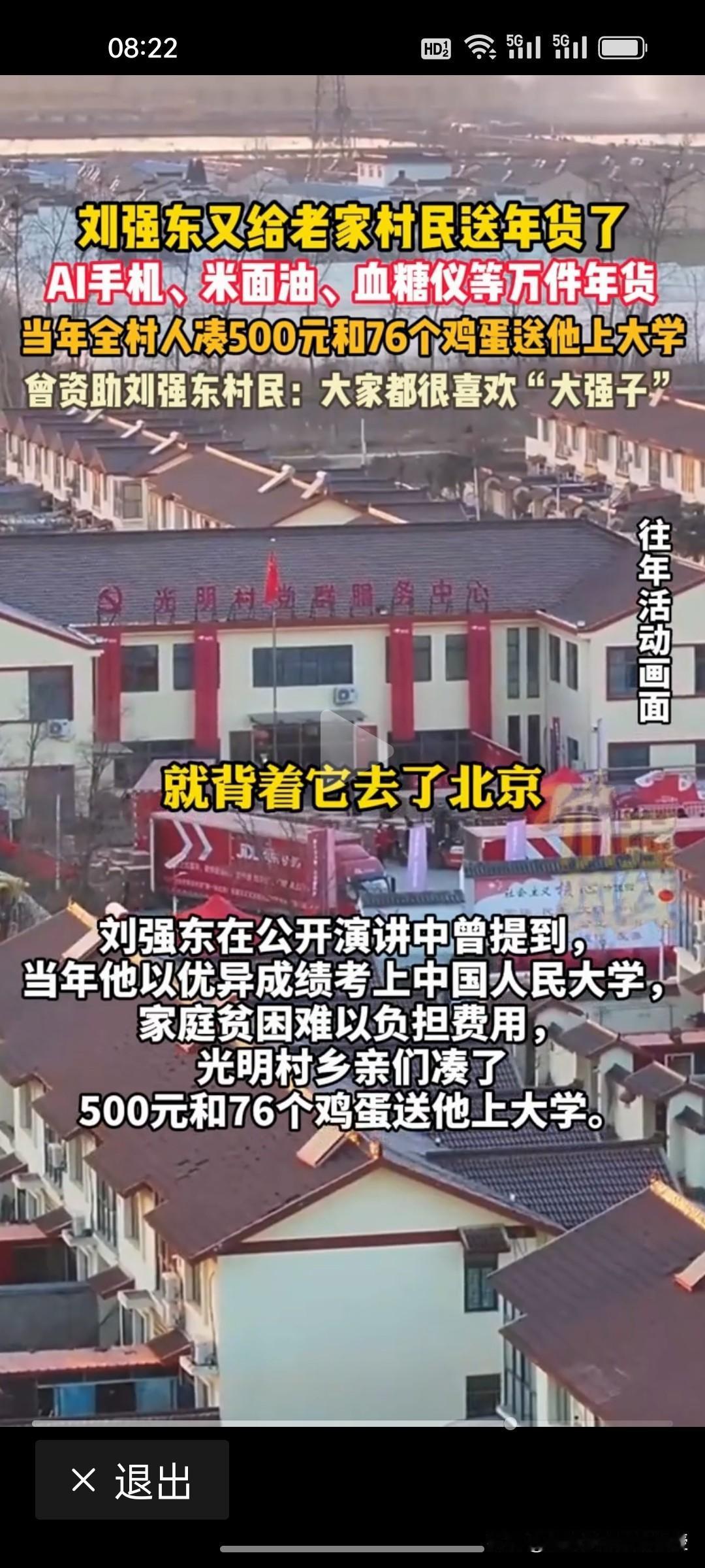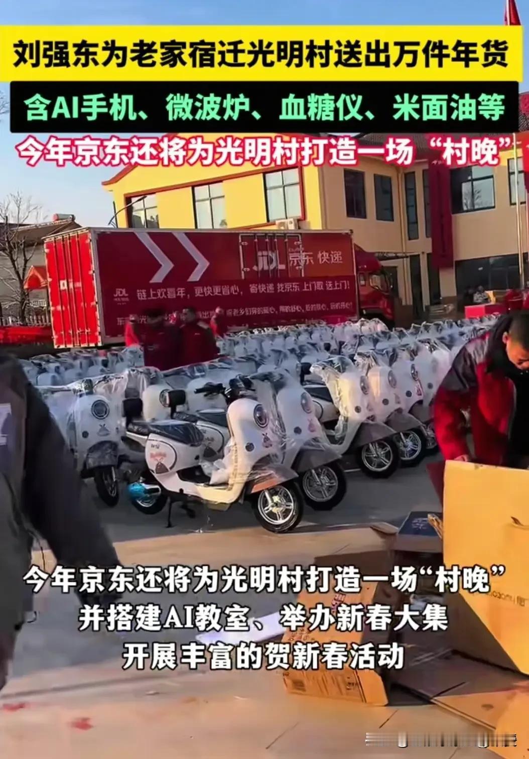 当年带着76个鸡蛋和500元走出宿迁的刘强东,如今他带着万件年货、无人车和AI春晚回到了光明村。 今年的回馈不止米面油和红包,更有无人车送年货、AI春晚和AI教室,让乡亲们直接触摸到科技前沿。从14年前第一次给老人发红包,到如今用科技改变家乡,他的感恩早已超越了物质帮扶,变成了让乡亲们跟上时代的底气。 这不仅是不忘本,更是把“滴水之恩”变成了“发展之泉”。你觉得这样送新意年货的感恩方式,是不是比单纯捐钱更有意义?