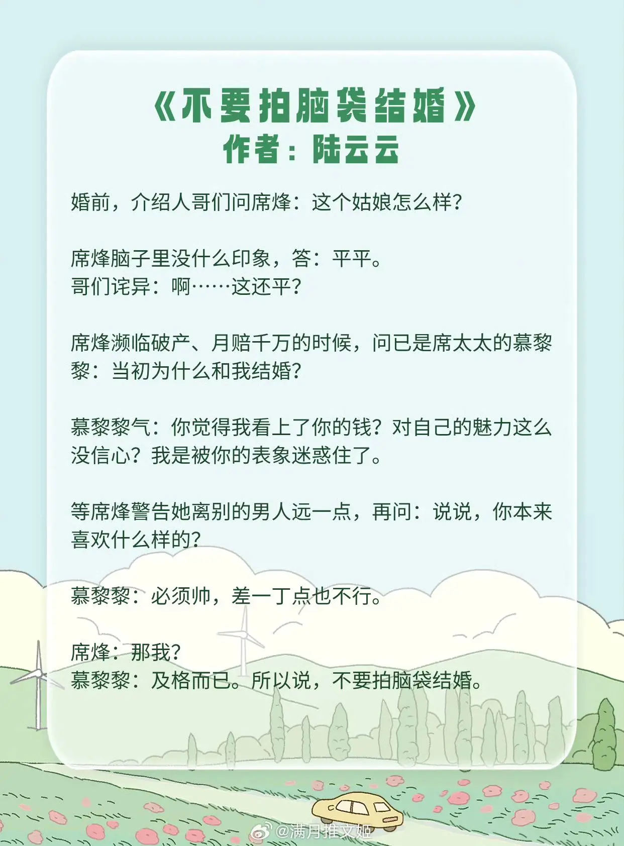 【男主套路女主文】嫁给我,如何? 《权臣的在逃白月光》作者:西西东东 《不要拍脑袋结婚》作者:陆云云 《真千金她又躺下了》作者:元余 《响空山》作者:鹿水灵 《男主他头铁》作者:青木源 《你看见我的鸟了吗》作者:西子绪 推文言情小说推荐