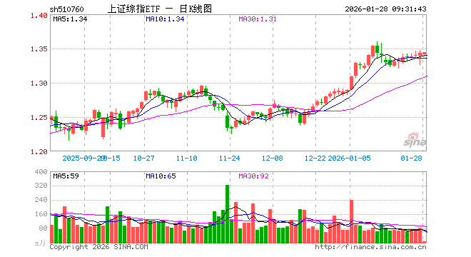 1月28日,上证综指ETF(510760)开盘跌0.15%,报1.341元。上证综指ETF(510760)重仓股方面,农业银行开盘跌0.58%,工商银行跌0.28%,中国石油涨1.53%,贵州茅台涨0.00%,招商银行涨0.05%,中国人寿跌0.16%,中国银行跌0.19%,中国平安涨0.86%,工业富联涨2.18%,紫金矿业涨1.95%。