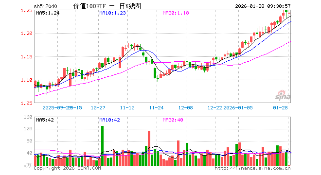 1月28日,价值100ETF(512040)开盘跌0.24%,报1.241元。价值100ETF(512040)重仓股方面,模塑科技开盘跌0.37%,亚翔集成涨6.28%,久立特材涨0.85%,云铝股份涨1.06%,伟隆股份涨0.09%,三七互娱涨0.34%,豫光金铅涨6.15%,亚普股份跌0.38%,厦门钨业跌6.54%,中国太保跌0.45%。