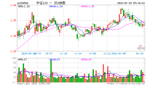 1月28日,中证A50ETF(159591)开盘跌0.22%,报1.333元。中证A50ETF(159591)重仓股方面,宁德时代开盘跌0.45%,贵州茅台涨0.00%,中国平安涨0.86%,中际旭创涨2.66%,紫金矿业涨1.95%,招商银行涨0.05%,美的集团跌0.01%,长江电力涨0.00%,立讯精密跌0.04%,中信证券涨0.11%。