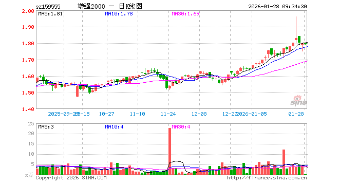 2000增强ETF(159555)业绩比较基准为中证2000指数收益率,管理人为银华基金管理股份有限公司,基金经理为张凯、张亦驰,成立(2023-12-01)以来回报为79.79%,近一个月回报为9.23%。